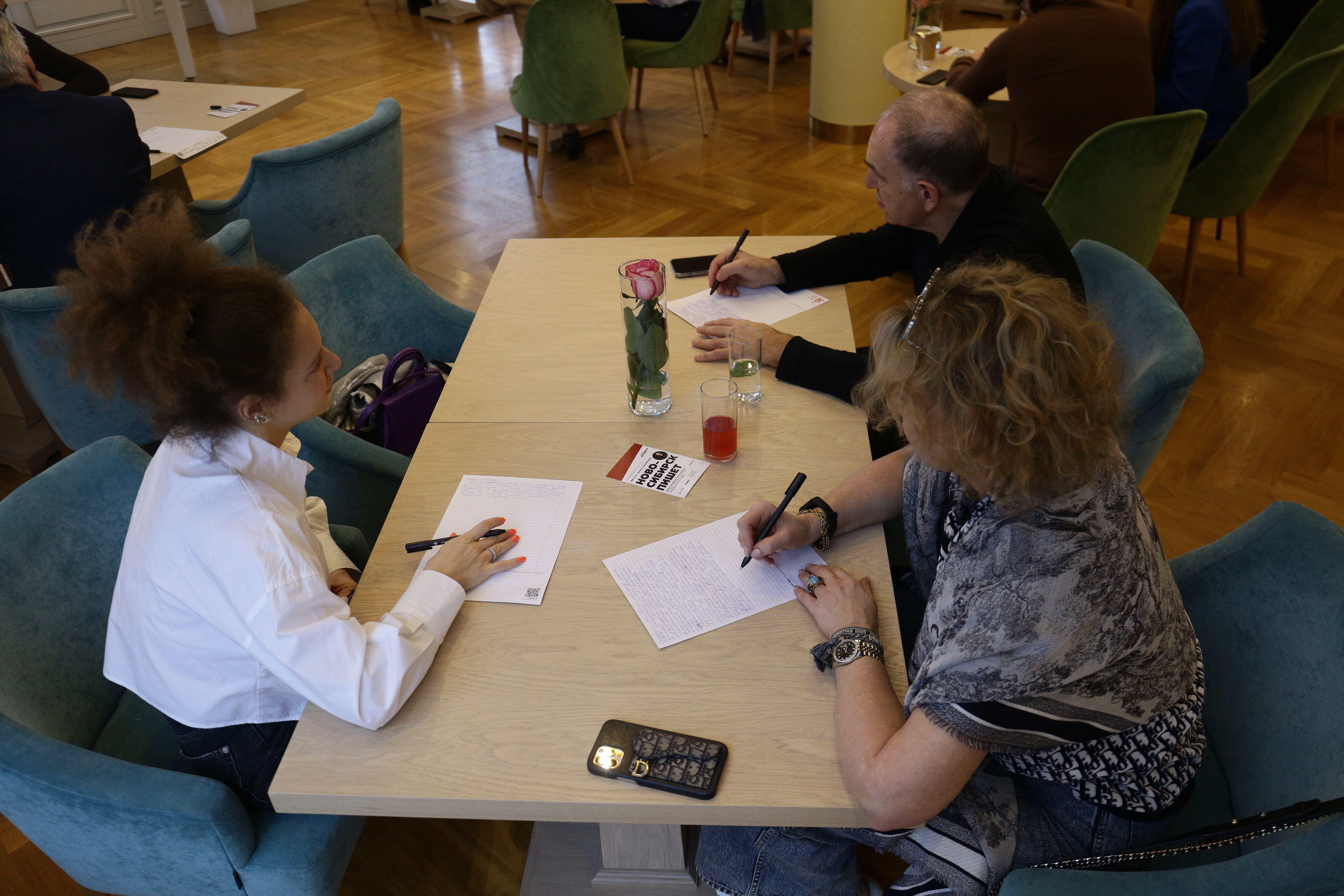 В кинотеатре «Победа» текст писали под диктовку лидера рок-группы «Ундервуд» Максима Кучеренко и актёра Даниила Спиваковского.