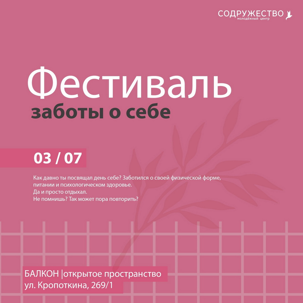 В субботу, 3 июля, в пространстве «Балкон» пройдёт «Фестиваль заботы о себе». Вас ждёт целый день полезных практик, тренировок и релакса. Будут работать четыре площадки.