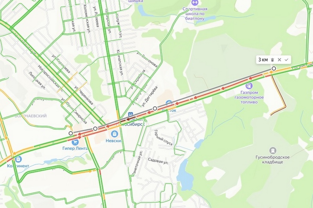 По данным сервиса Яндекс Карты, ярко-красная зона растянулась на три километра по Гусинобродскому шоссе. Затруднено движение от кладбища до гипермаркета «Лента». По заявлениям очевидцев, на погосте сегодня собралось множество посетителей. Они приехали в преддверии Радоницы привести в порядок могилы.