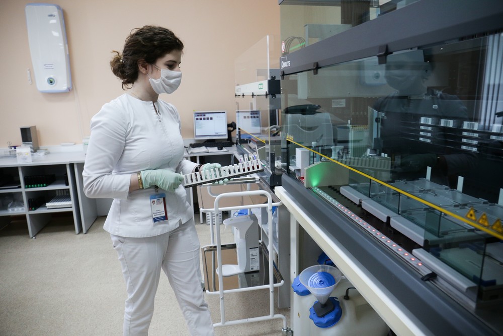 «Есть иммуногематологическая лаборатория, где определяют группу крови. Биохимическая лаборатория, где определяются АЛТ и общий белок для доноров плазмы. Есть лаборатория ИФА, где серологическими методами определяется наличие антител, и лаборатория ПЦР-диагностики, где определяются антигены возбудителей. Затем все компоненты проходят лабораторию контроля качества», — перечисляет заместитель главного врача по медицинской части Новосибирского клинического центра крови Наталья Просвирина.