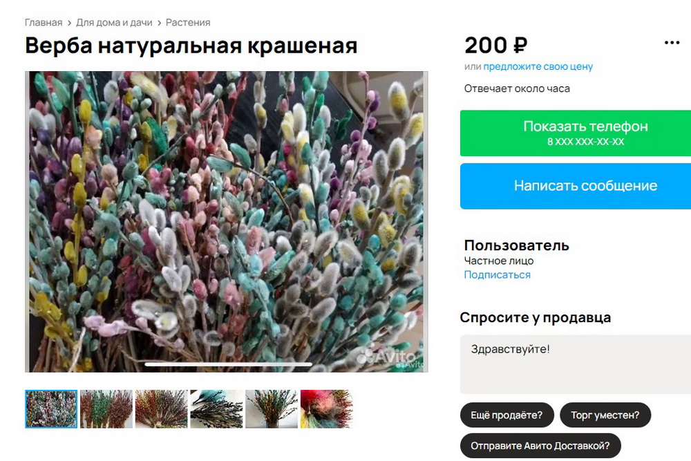 Вербой торгуют даже на «Авито». На сайте насчитывается около 20 объявлений о её продаже оптом и розницу. Цена — от 50 рублей за небольшой пучок до 700 рублей за самые необычные решения. Например, покупателей удивляют крашеной вербой за 200 рублей, собранные композиции с пожеланиями стоят 500 рублей, букет из 21 веточки в корзинке обойдётся в 350 рублей.