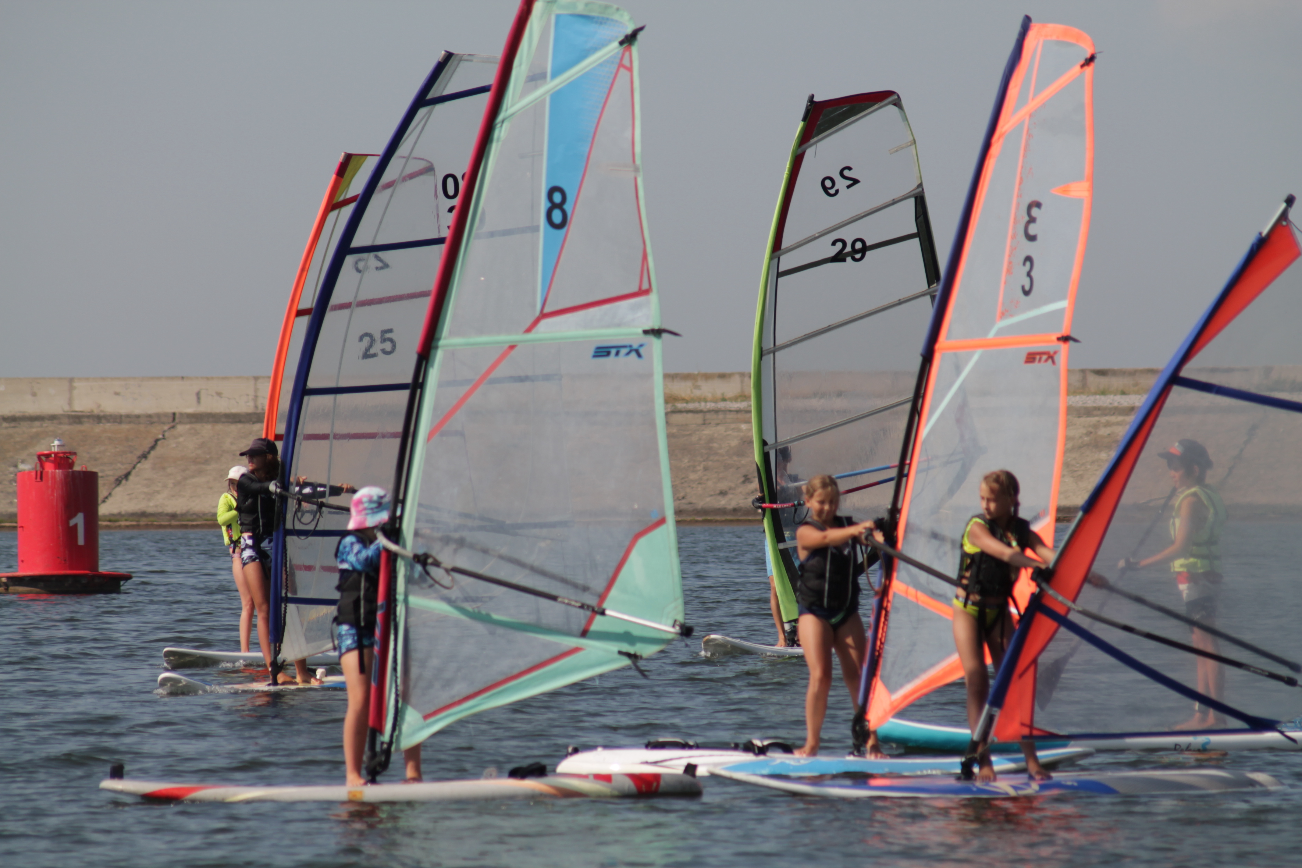 «Сегодня будем отрабатывать задание по дистанции — на море стоят буйки, нужно пройти между двумя буями, обогнуть третий и финишировать в те же самые ворота. На самом деле непростое упражнение — нужно войти в ворота, чтобы тебя не снесло ветром», — командует тренер Нина Рейценштейн.