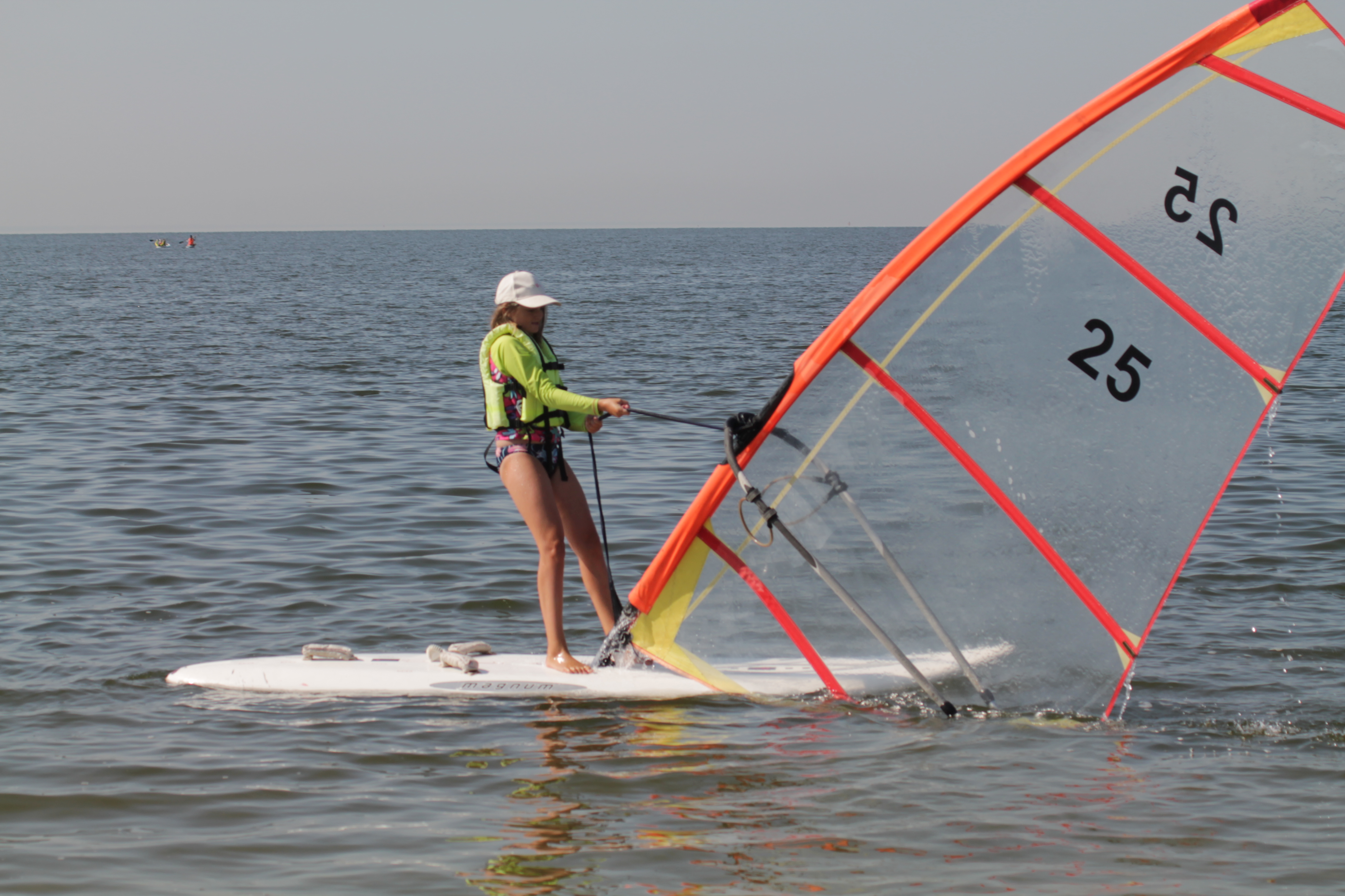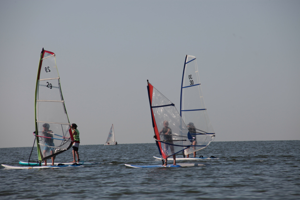 Те, кто постарше, стараются обгонять друзей. Для этого используют технику «пампинг». По сути, ты машешь парусом, как будто встряхиваешь после стирки мокрую простыню, и от этого сёрф двигается быстрее. Кто больше всего работает на дистанции с парусом, тот всегда оказывается в лидерах, говорят опытные спортсмены.