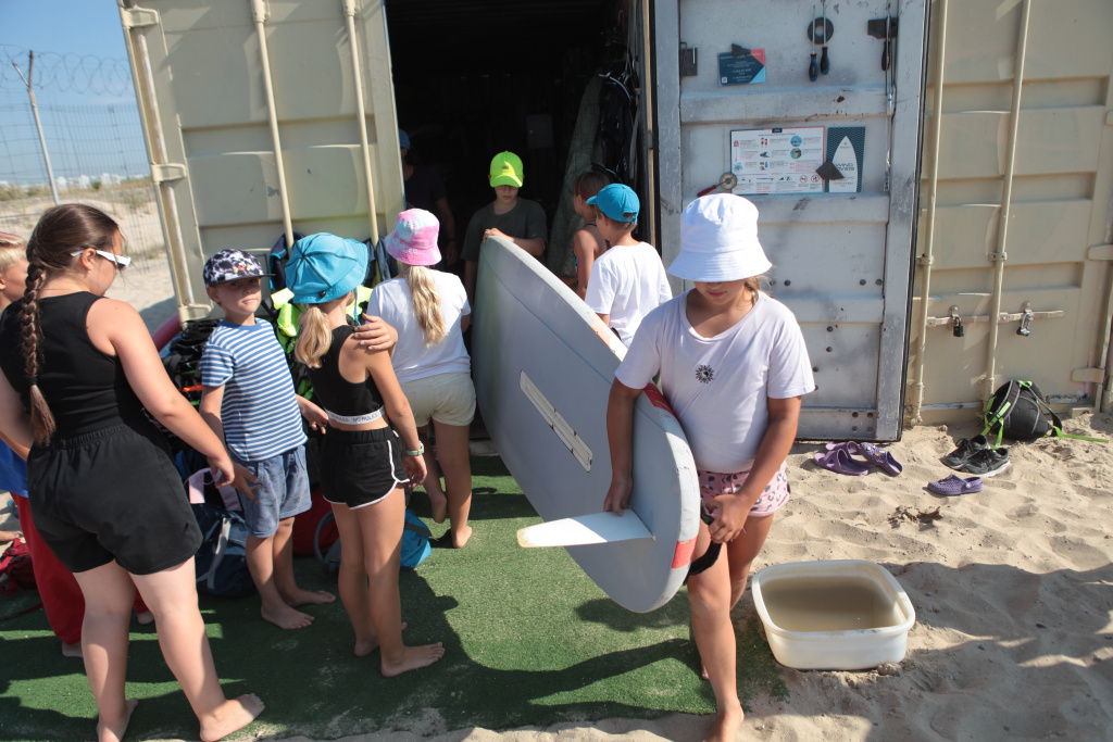 На берегу к нашему приходу началась суета. Нужно подготовить снаряжение к отплытию. В детских руках доски для виндсёрфинга похожи на больших цветных рыб с плавниками.