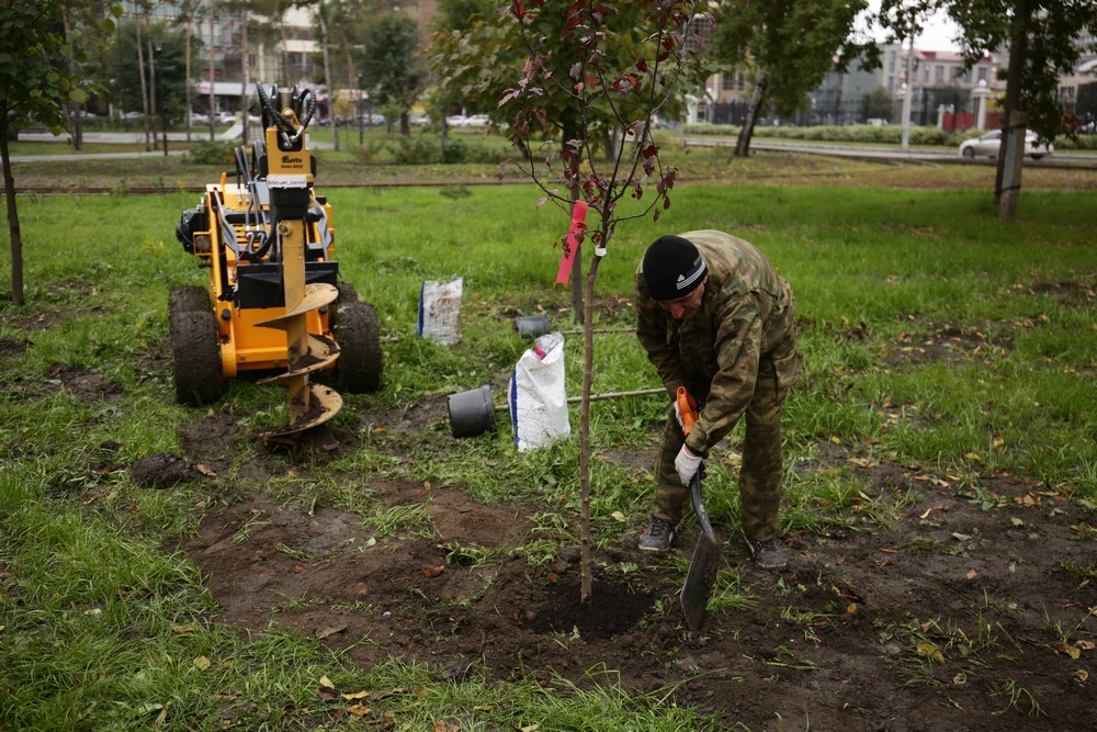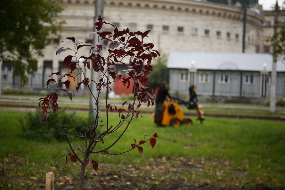 Молодые яблони сорта «Роялти» высадили в сквере за оперным театром рано утром в четверг, 30 сентября. Молодым саженцам предстоит пережить долгую зиму. Холода сорту «Роялти» не страшны, говорят специалисты.