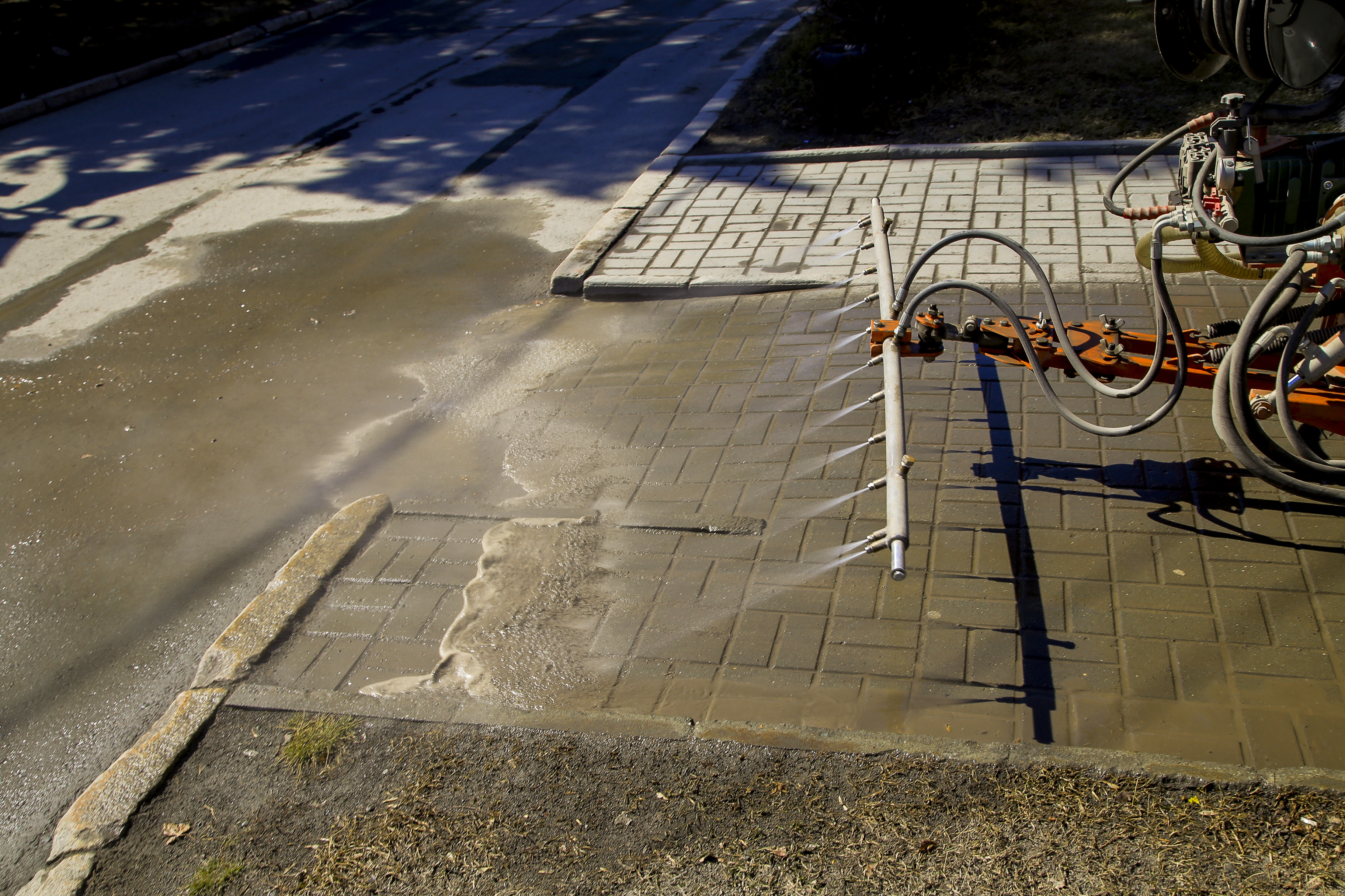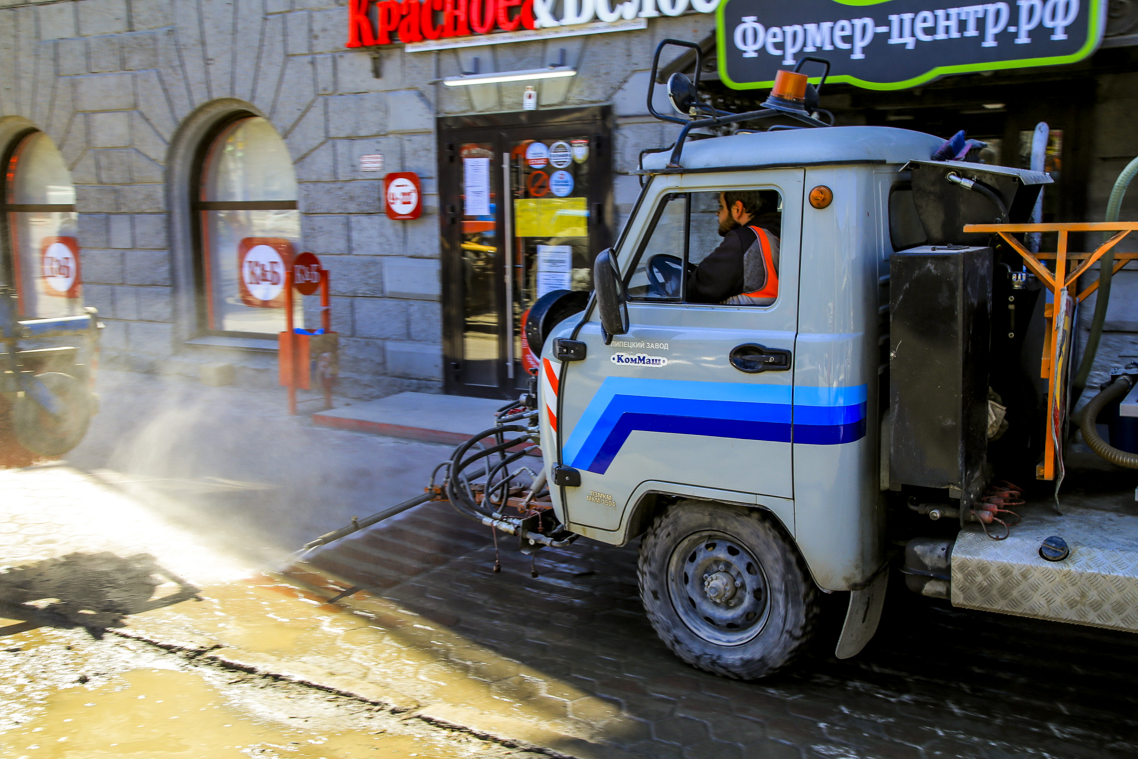 В пятницу убирают улицу Станиславского. Работают сообща — дворники сметают грязь в труднодоступных местах, а небольшие машины промывают тротуары.