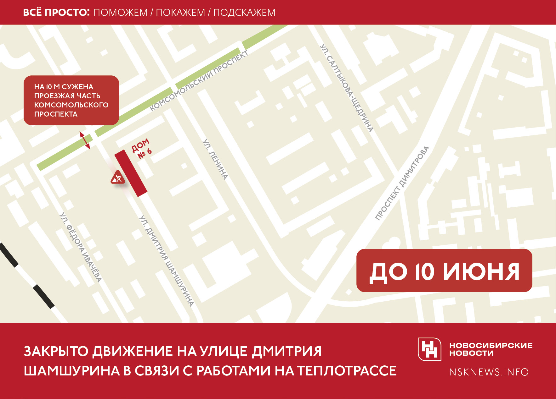 До 10 июня в Железнодорожном районе Новосибирска закрыта для проезда улица Дмитрия Шамшурина возле дома №6. До этого же времени на десять метров сузили проезжую часть Комсомольского проспекта.