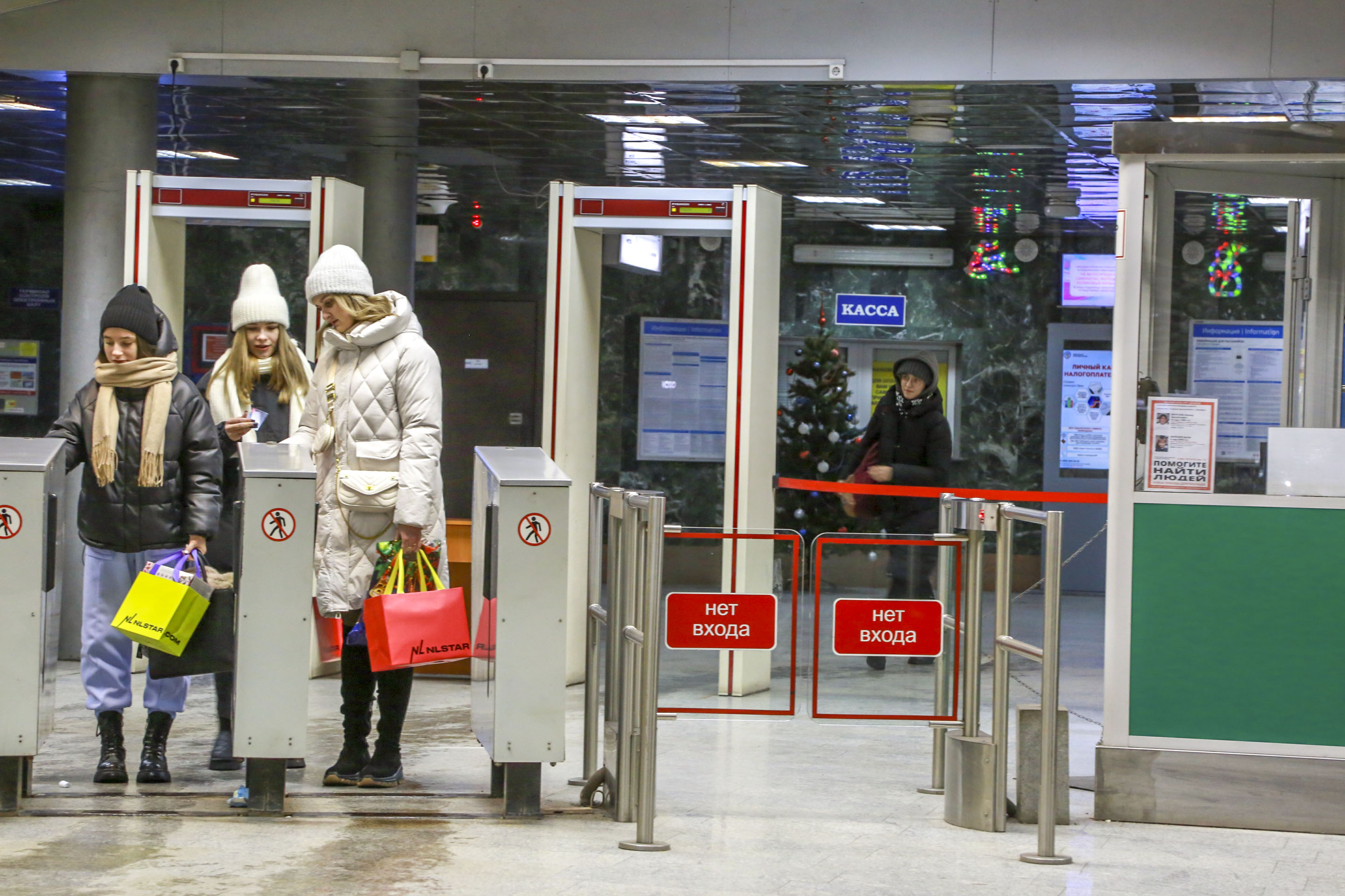 Входные павильоны декорировали иллюминацией, чтобы создать у пассажиров новогоднее настроение.