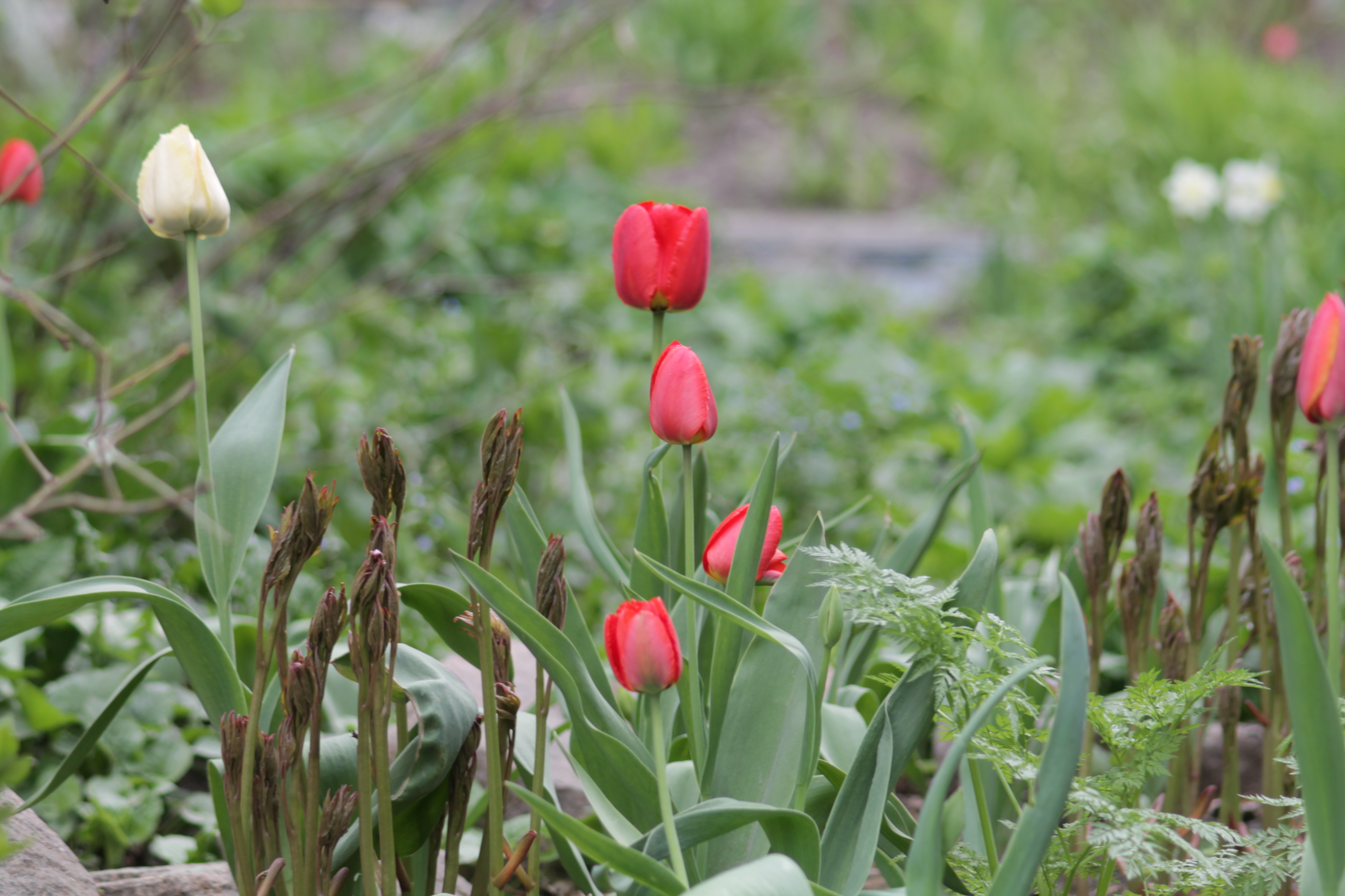 На полянах, где много солнца, уже распустились подснежники, по-научному называемые прострелом, и одуванчики. В палисадниках во дворах жилых домов кое-где робко расцвели первые тюльпаны.