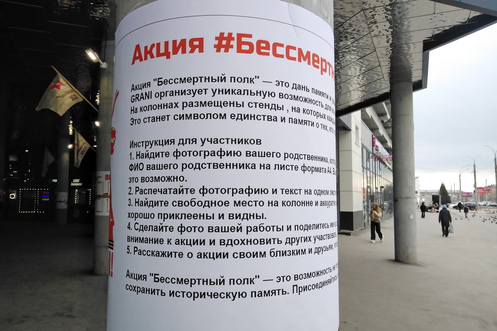 На несущих восьми колоннах здания появились плакаты, сообщающие о старте проекта «Бессмертный полк». В пояснительной записке изложены условия участия в акции. Новосибирцам предлагают найти фотографию родного фронтовика, распечатать её в формате А4, добавить к портрету биографическую справку (даты жизни, звание, награды, краткий рассказ о подвиге бойца) и приклеить в рамку на одну из колонн.