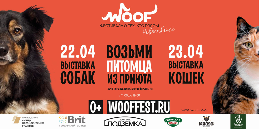 Благотворительный фестиваль WOOF с раздачей кошек и собак из приютов пройдёт 22 и 23 апреля в лофт-парке «Подземка». Проект объединит новосибирских зоозащитников, их коллег из Москвы, а также горожан, желающих помочь. Люди, решившие забрать животных к себе домой, получат подарки.