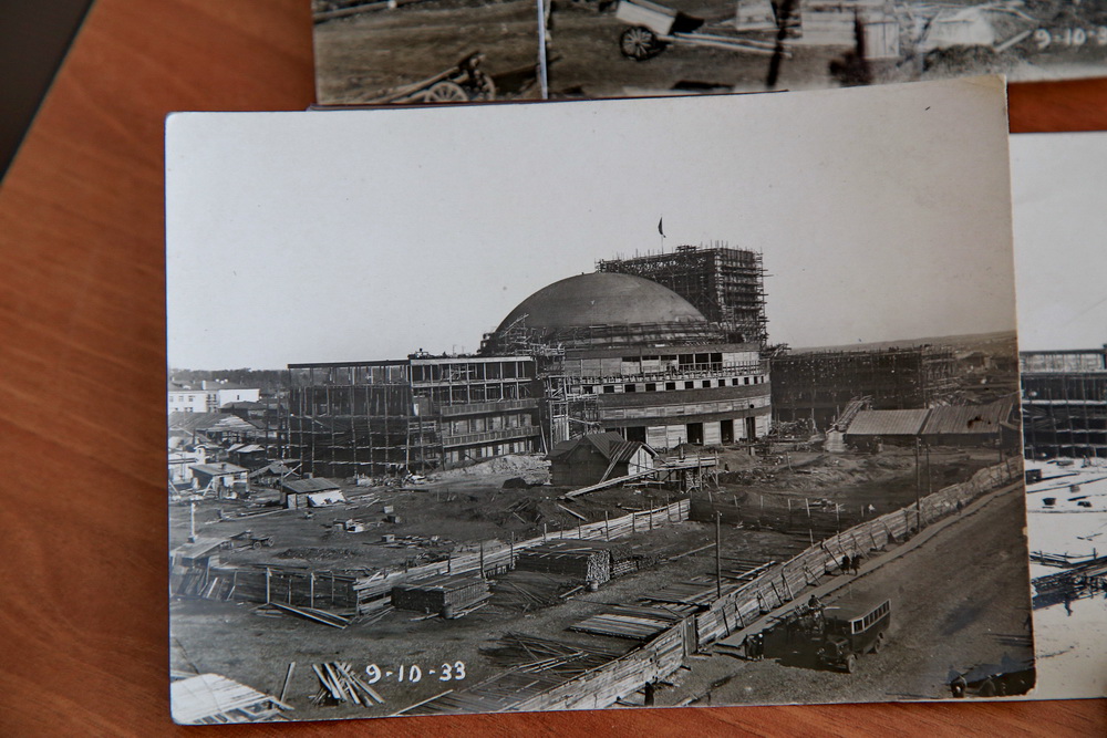 Сначала здание строили как «синтетический театр нового панорамно-планетарного типа» на основе конструктивистского проекта архитектора Т. Я. Бардта и художника М. И. Курилко. Затем концепцию откорректировал архитектор А. З. Гринберг. Он перекрыл зрительный зал гигантским куполом с железобетонными конструкциями, разработанными доктором технических наук П. Л. Пастернаком при участии инженера Б. Ф. Матэри. В 1933 году главным архитектором стройки стал Б. А. Гордеев. Со сменой стилистических принципов в середине 30-х годов окончательный проект приняли в неоклассическом оформлении. В 1937-м макет театрального здания получил Гран-при на выставке в Париже.