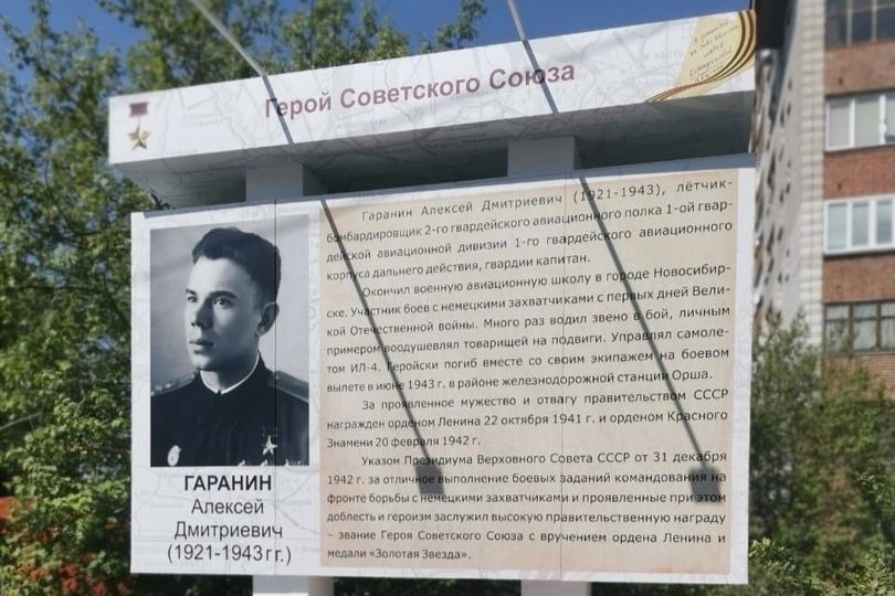 — Героя Советского Союза Алексея Дмитриевича Гаранина (1921-1943) — новосибирского лётчика, геройски погибшего вместе со своим экипажем в районе станции Орша;