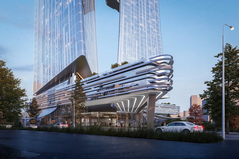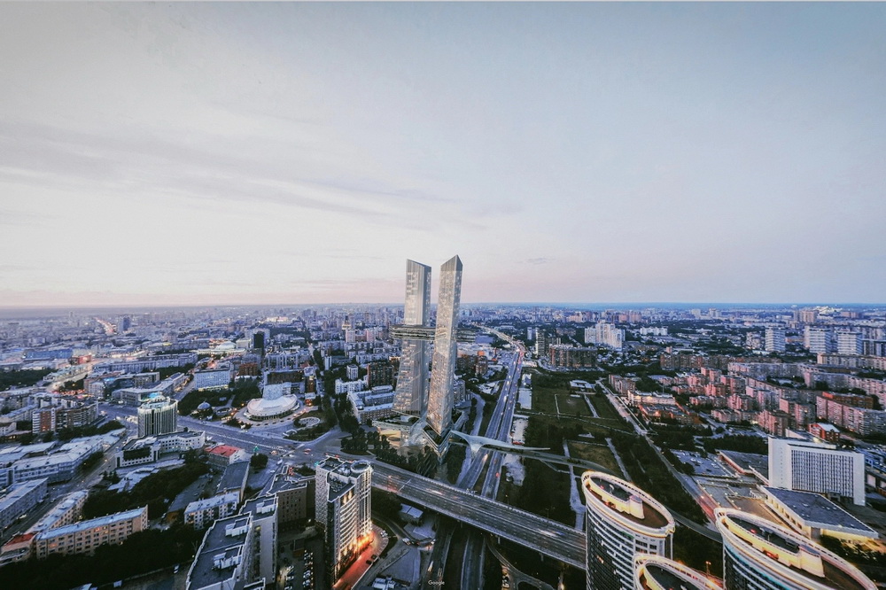 Автор создал объём из двух башен, нижней стилобатной части и подвесной консоли. Консоль поддерживает линию Октябрьской магистрали, нижняя стилобатная часть — окружающую застройку. Две 60-этажные, сужающиеся к верху треугольные башни в форме буквы «Н» вырастут на 220 метров. Правая башня имеет наклон в 5 градусов.