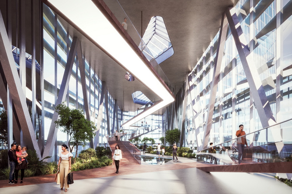 Главный — парадный — вход в общественную зону и гостиницу будет находиться со стороны Октябрьской магистрали. Вход в конгресс-центр — со стороны улицы Семьи Шамшиных. Оба объединены общим атриумным пространством, выполняющим функцию внутреннего двора.
