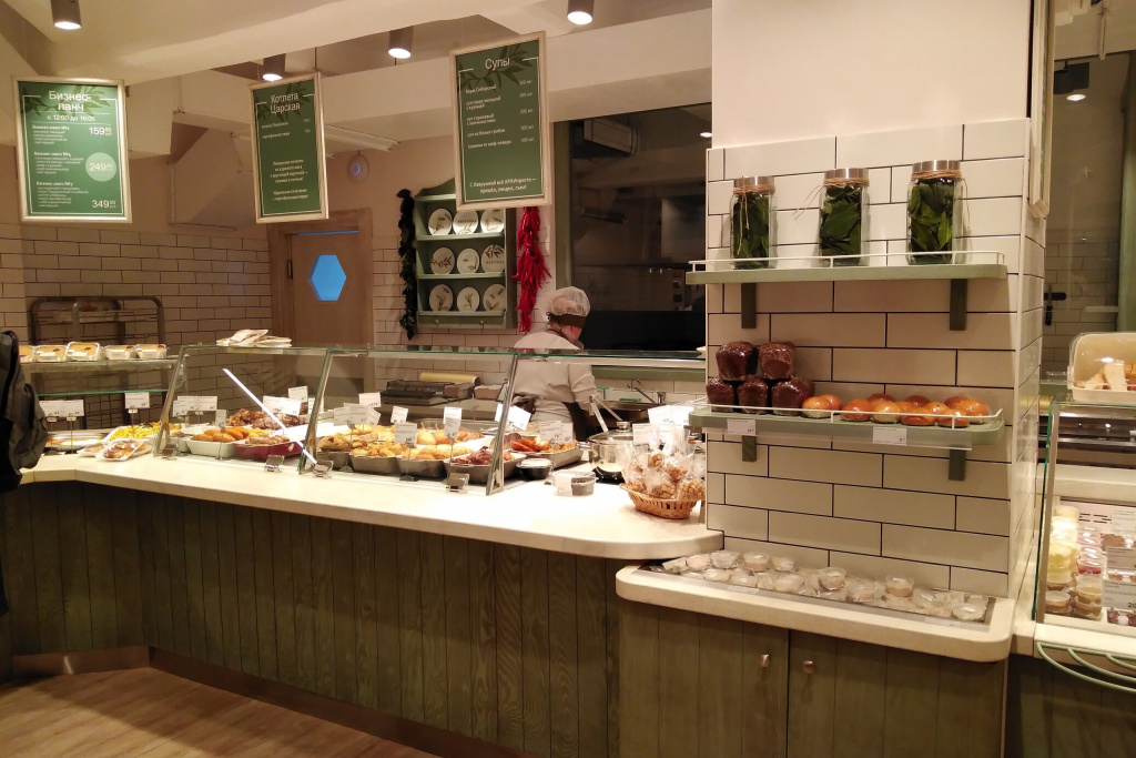 Точка общепита с традиционной раздачей совмещена с кулинарией и маркетом, где продают свежие ягоды, овощи и фрукты, всевозможную выпечку, товары для дома, бакалею и напитки. В кафе есть зона с множеством столиков, где могут перекусить не только посетители из вуза, но и все желающие.