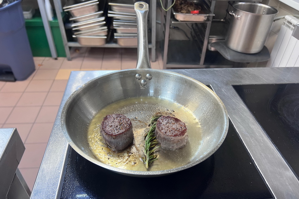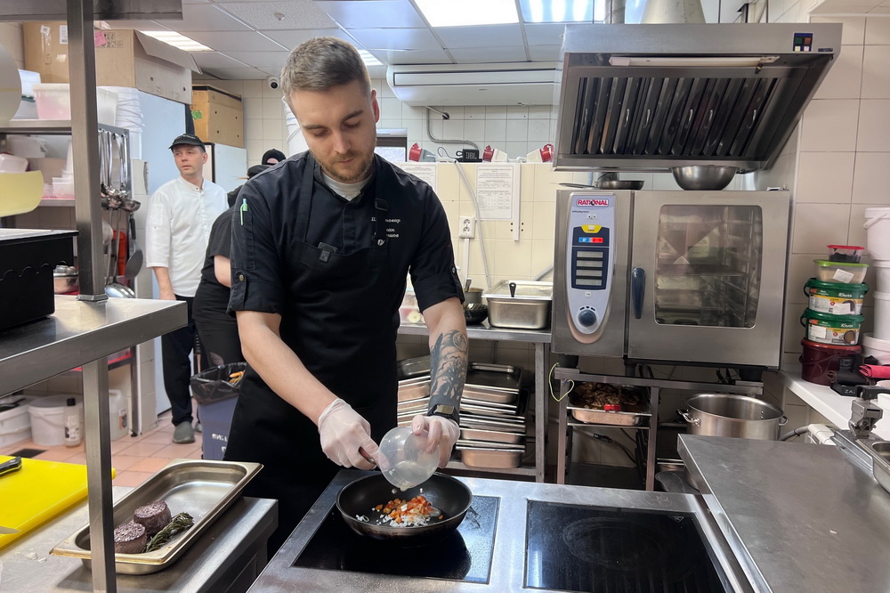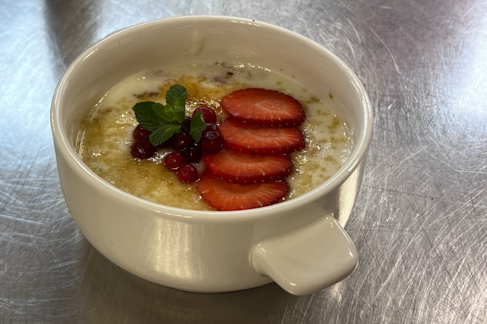 «Из злаков у нас гурьевская каша. Из молочных продуктов это бриошь, потому что, хоть это и хлеб, он на 60% состоит из сливочных продуктов. Из яйца мы представляем омлет с енисейским муксуном. Муксун — это северная рыба, сибирская, является нашим локальным продуктом», — рассказал бренд-шеф парка-отеля «Сосновый бор» Андрей Коробкин.