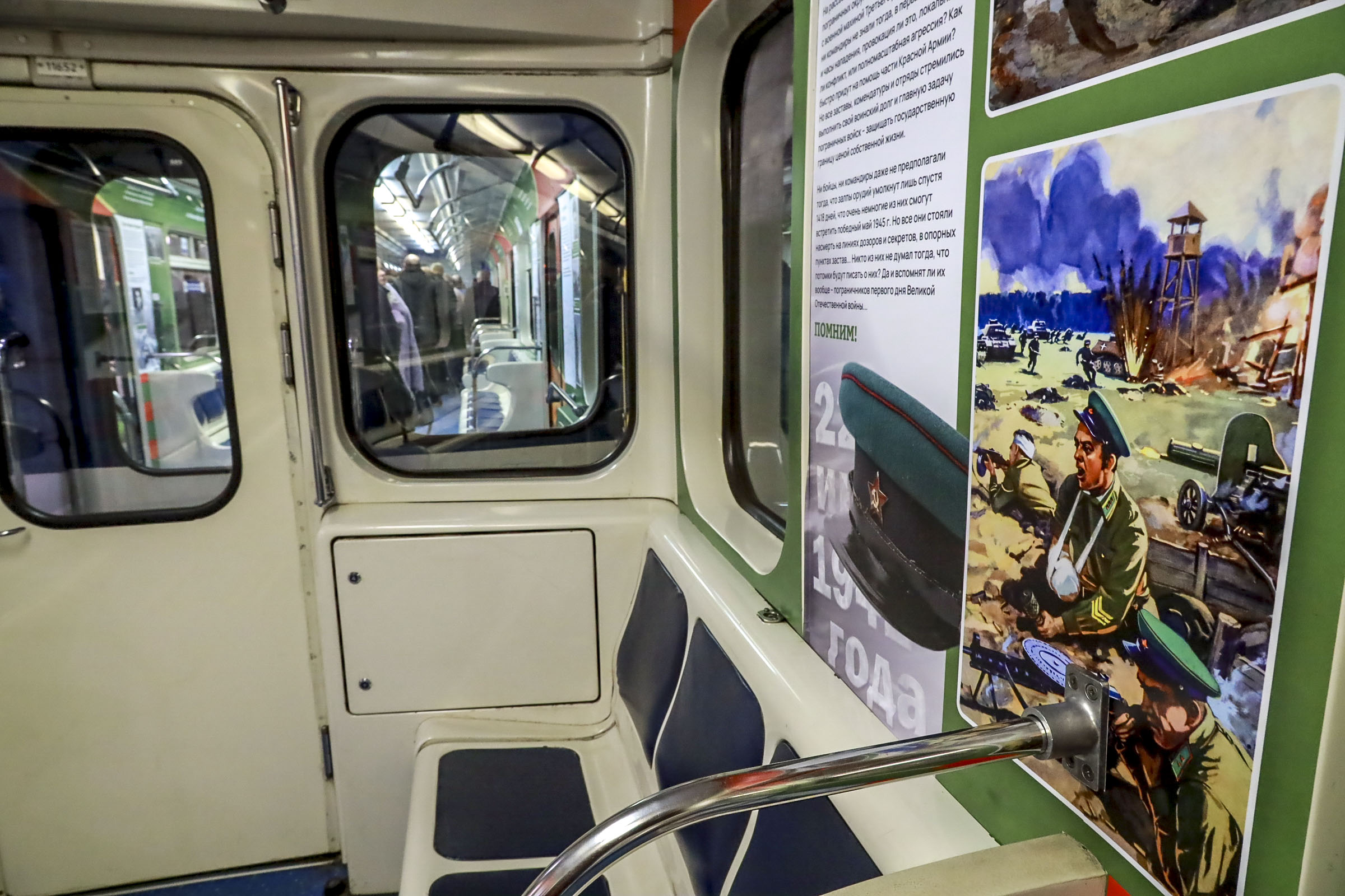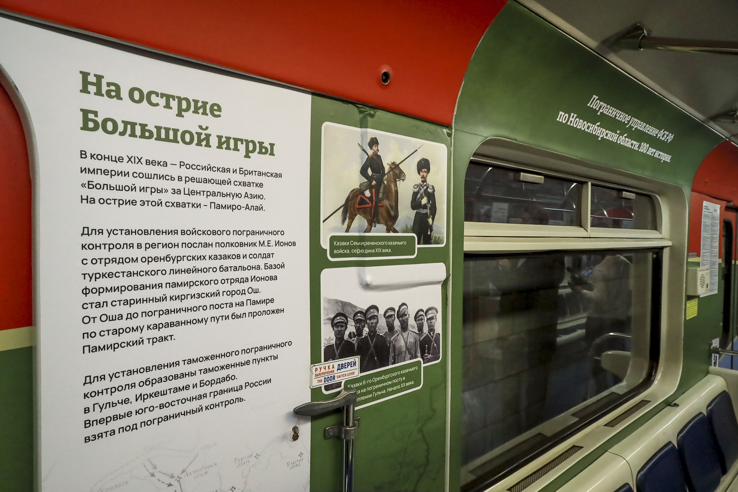 На стенах вагонов разместили уникальные фотографии и документы, раскрывающие историю пограничного управления ФСБ России по Новосибирской области. Экспонаты в одном из вагонов повествуют о подвигах новосибирцев, которые в разные годы охраняли границу нашего государства и выполняли задачи за его пределами, а также в зоне СВО.
