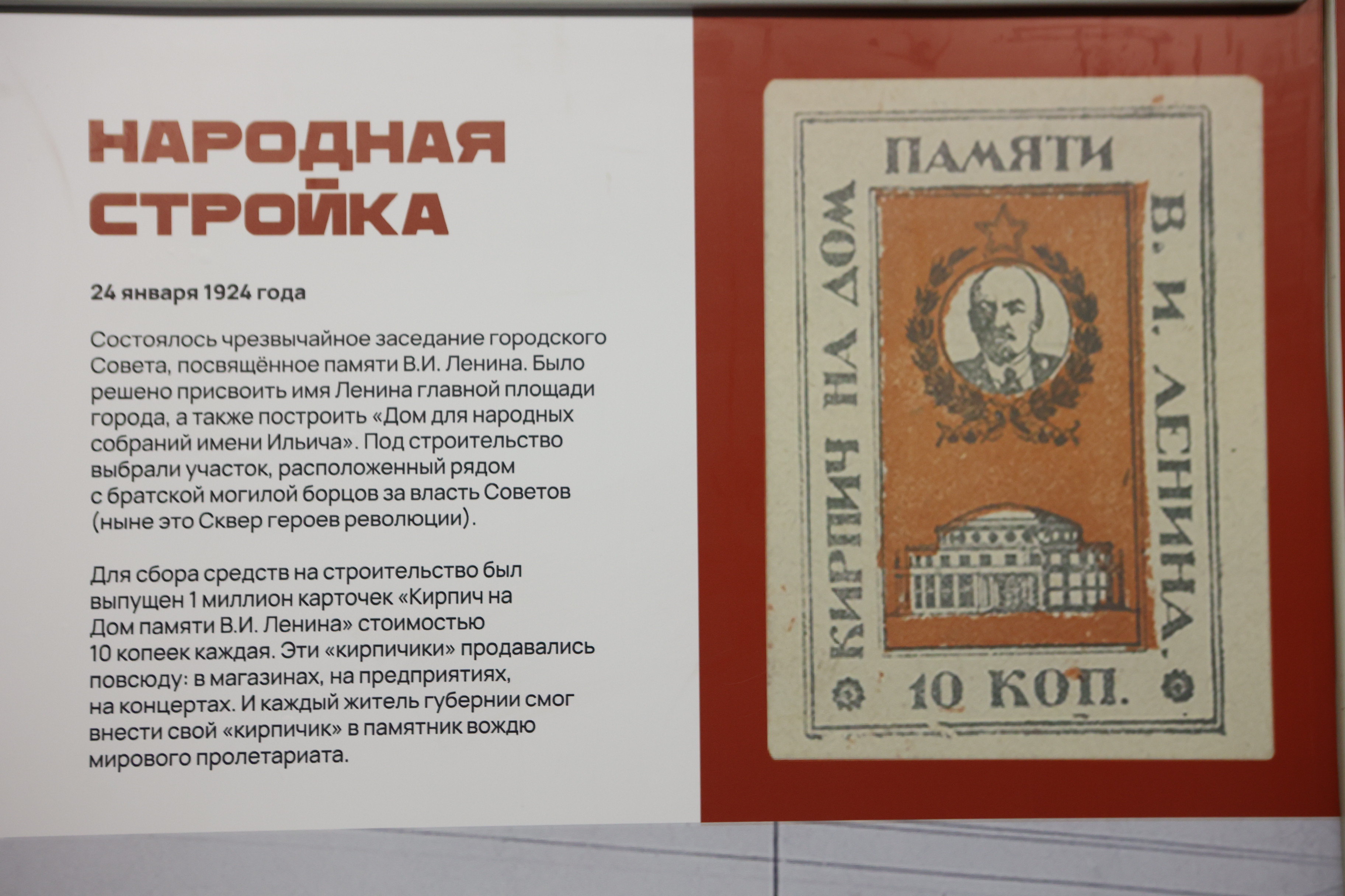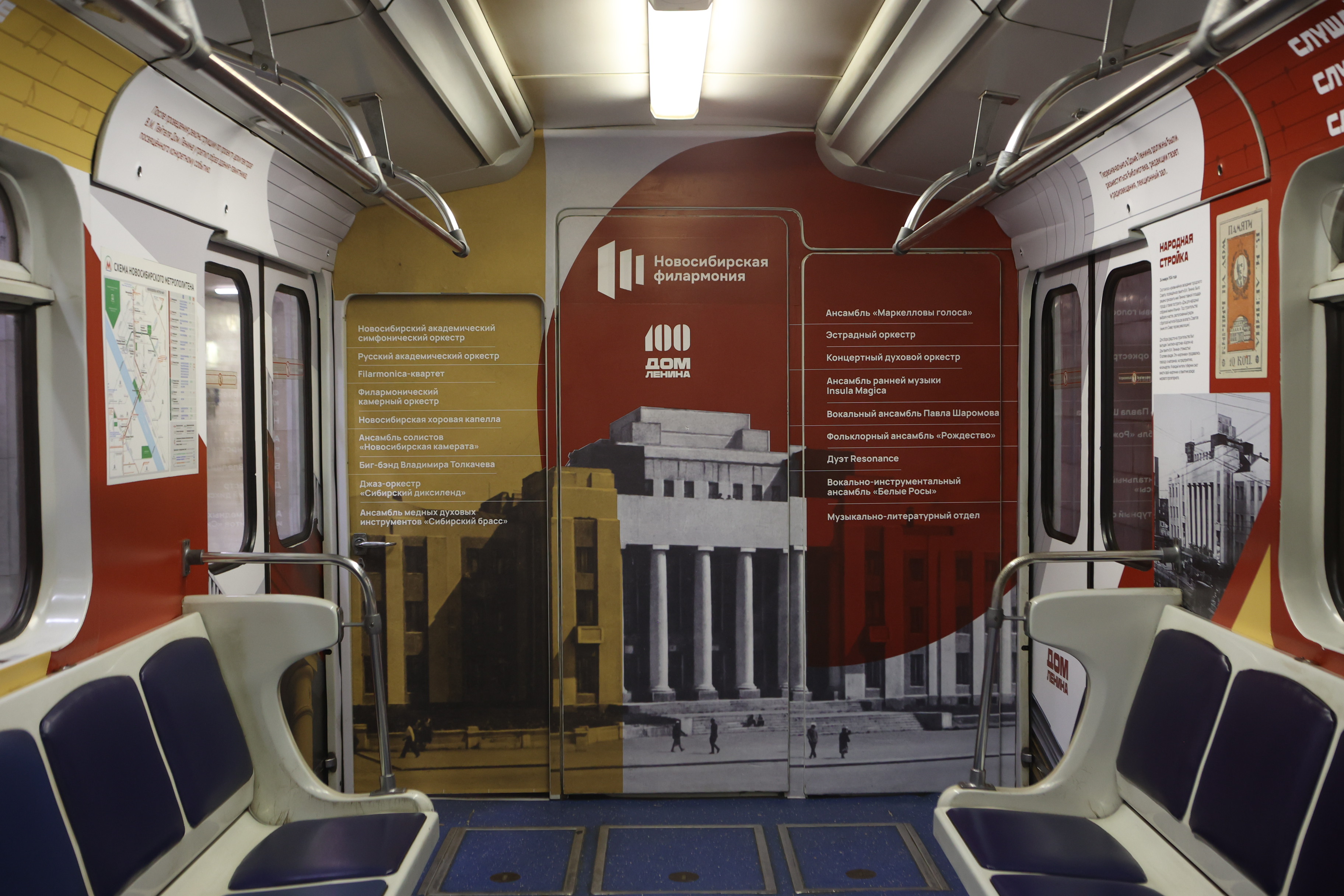 Брендированный вагон запустили в новосибирской подземке к 100-летию Дома Ленина. Выставка «на колёсах» рассказывает интересные факты о строительстве знакового для Новосибирска здания. Его возводили на народные деньги, чтобы почтить память вождя мирового пролетариата. Чтобы собрать нужную сумму, напечатали карточки в виде кирпичей: каждая стоила столько же, сколько реальный кирпич.