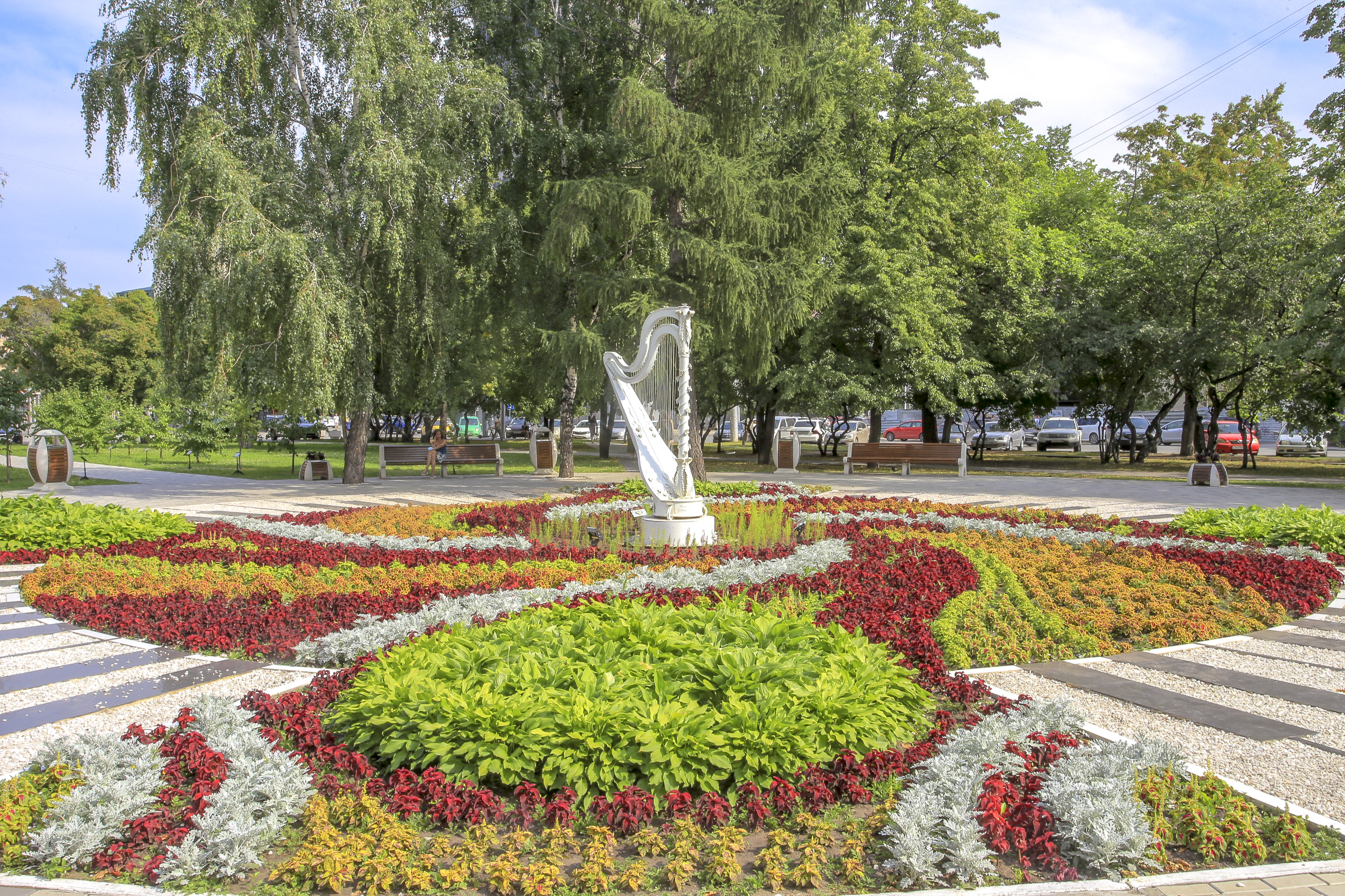 Цветники возле оперного театра — визитная карточка города. На центральной клумбе работники Горзеленхоза традиционно сажают сальвии. Они всё лето цветут красным колоском и очень красиво смотрятся по рисунку.