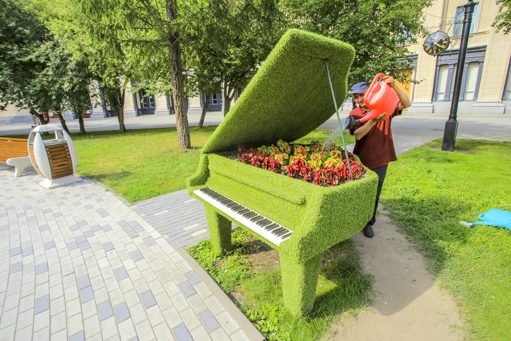 Ещё две клумбы обустраивают справа от театра. Летом тут традиционно появляется зелёный рояль с открытой крышкой, а внутри — цветы. Не менее популярный объект для фотосессий — клумба с белой арфой в центре.