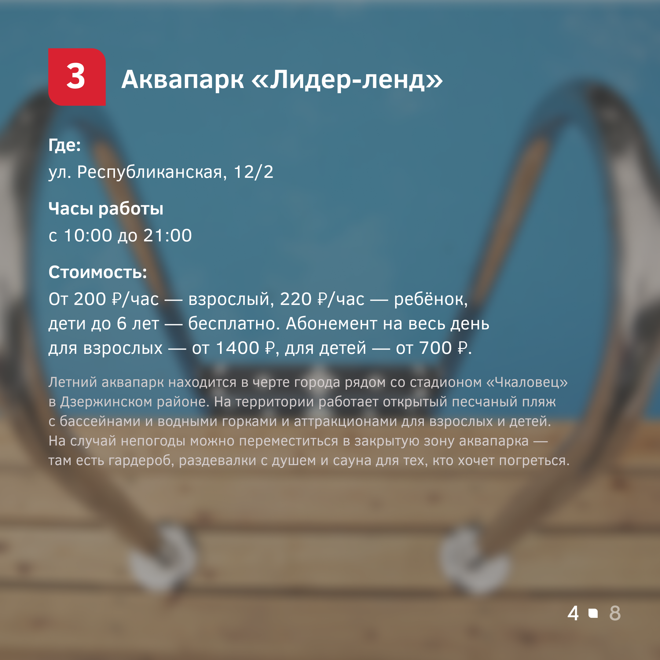 Летний аквапарк находится в черте города рядом со стадионом «Чкаловец» в Дзержинском районе. На территории работает открытый песчаный пляж с бассейнами и водными горками и аттракционами для взрослых и детей. На случай непогоды можно переместиться в закрытую зону аквапарка — там есть гардероб, раздевалки с душем и сауна для тех, кто хочет погреться.