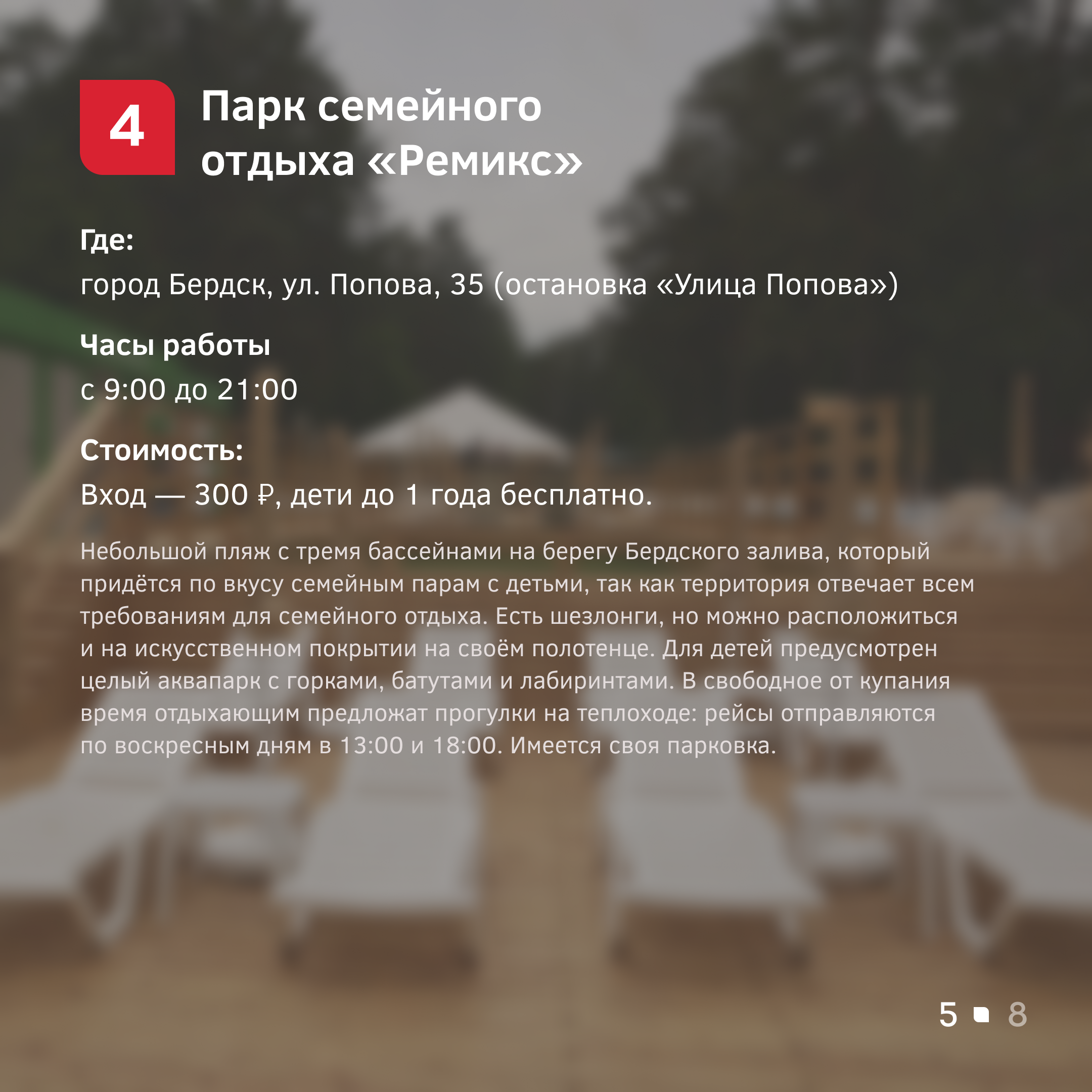 Небольшой пляж с тремя бассейнами на берегу Бердского залива, который придётся по вкусу семейным парам с детьми, так как территория отвечает всем требованиям для семейного отдыха.Есть шезлонги, но можно расположиться и на искусственном покрытии на своём полотенце. Для детей предусмотрен целый аквапарк с горками, батутами и лабиринтами. В свободное от купания время отдыхающим предложат прогулки на теплоходе: рейсы отправляются по воскресным дням в 13:00 и 18:00. Имеется своя парковка.