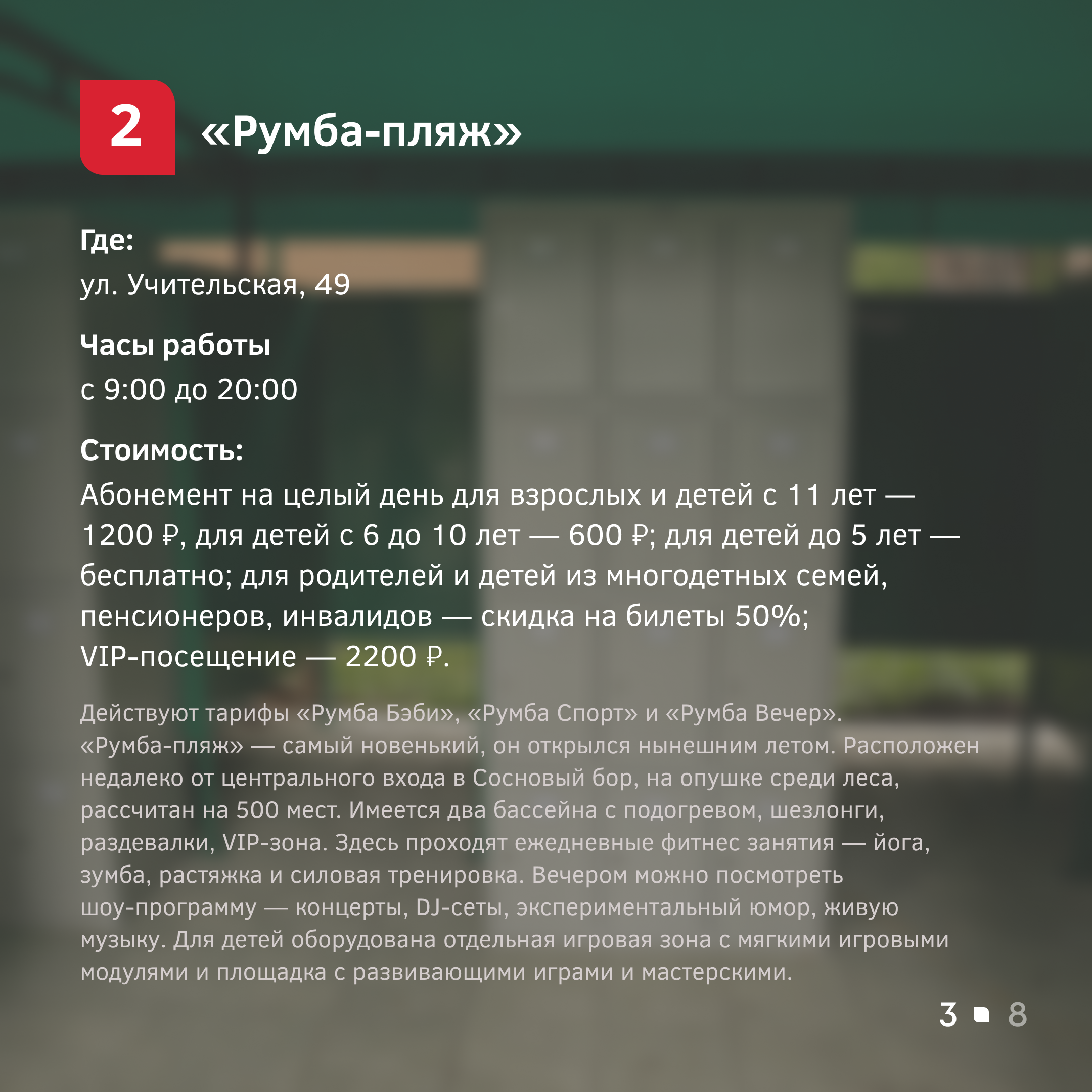 «Румба-пляж» — самый новенький, он открылся нынешним летом. Расположен недалеко от центрального входа в Сосновый бор, на опушке среди леса, рассчитан на 500 мест. Имеется два бассейна с подогревом, шезлонги, раздевалки, VIP-зона. Здесь проходят ежедневные фитнес занятия — йога, зумба, растяжка и силовая тренировка. Вечером можно посмотреть шоу-программу — концерты, DJ-сеты, экспериментальный юмор, живую музыку.