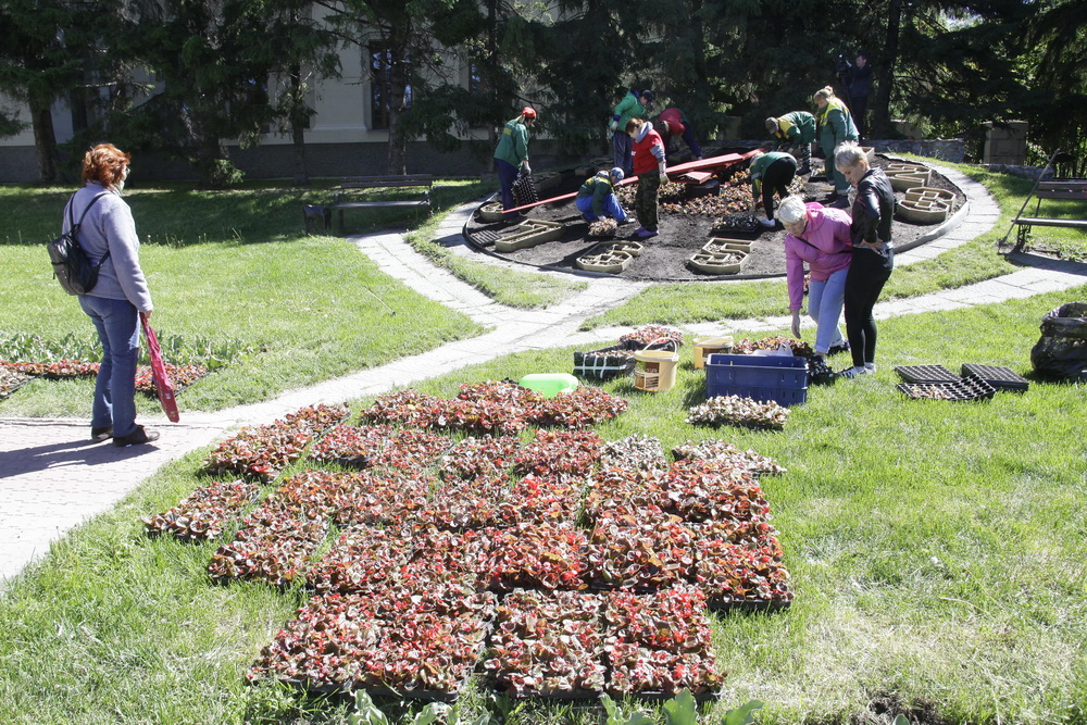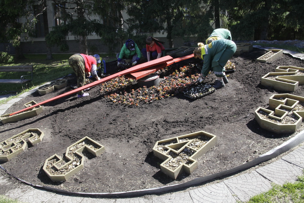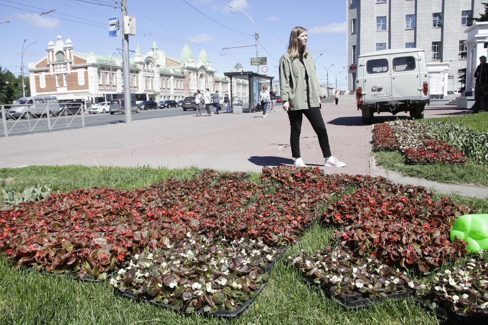 4000 цветов высадили на необычной клумбе у Дома Ленина. Красные и белые бегонии украсили собой необычные часы.