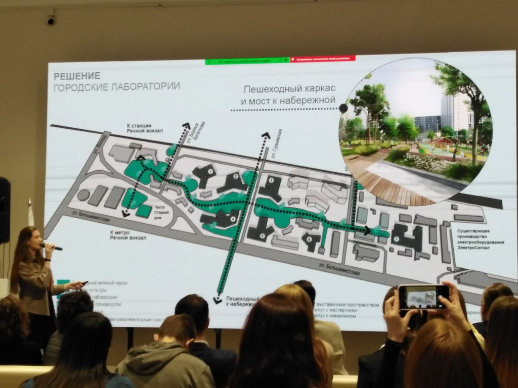 «Мы хотим создать зелёный каркас, который пойдёт от станции метро „Речной вокзал“ к старинному кирпичному зданию. В нём можно разместить выставочное пространство для наукоёмких производств, работ студентов и научных сотрудников», — поясняют авторы.