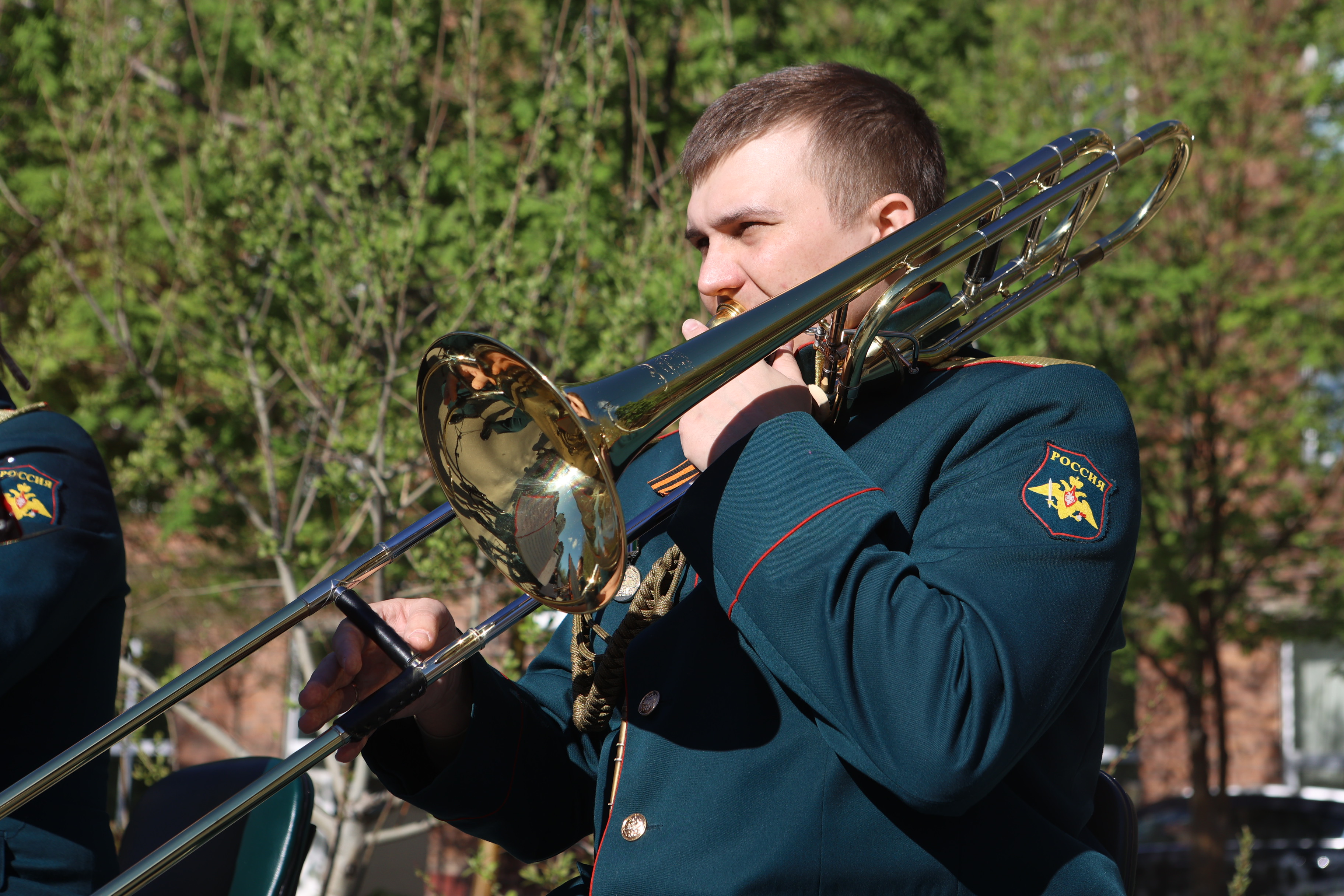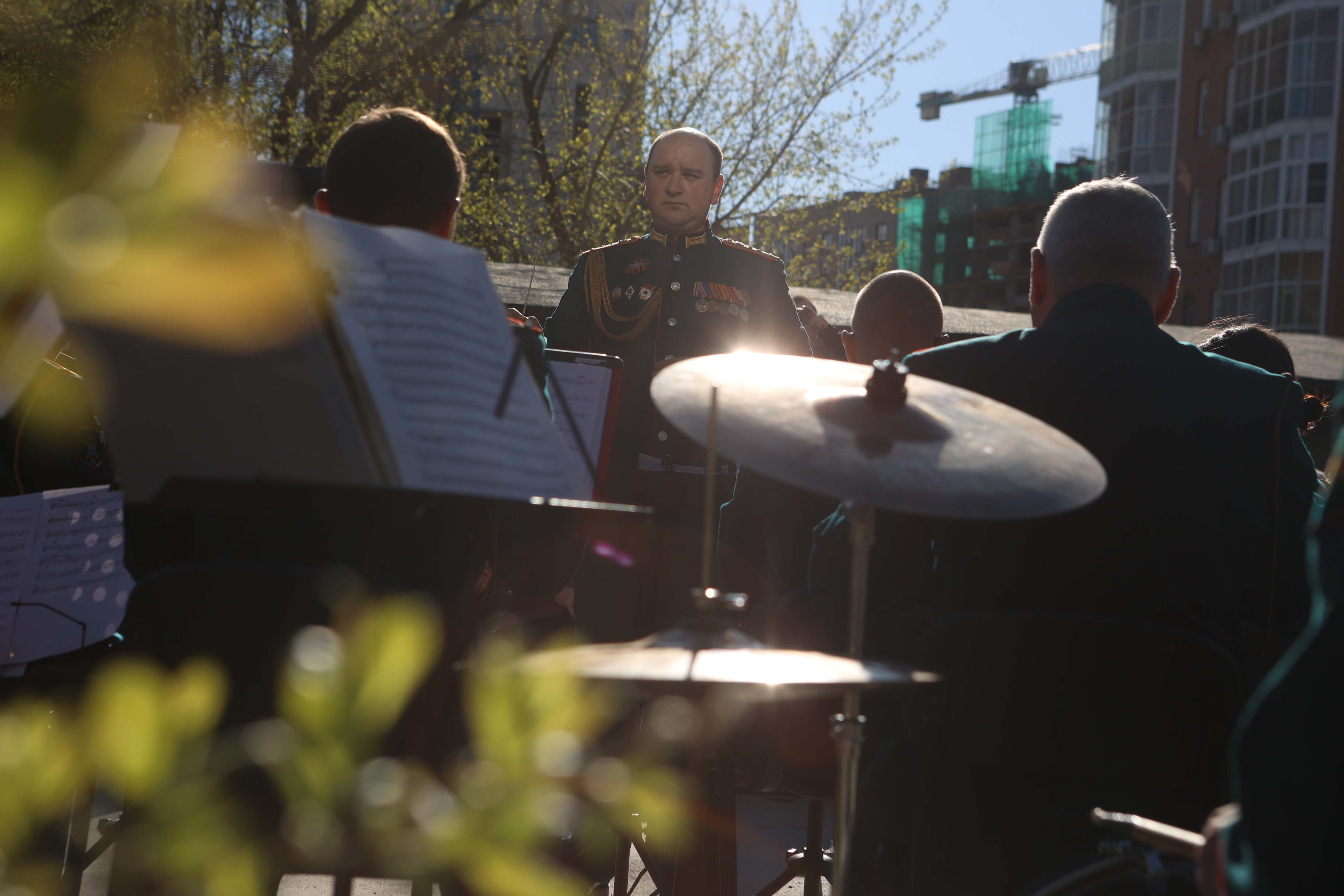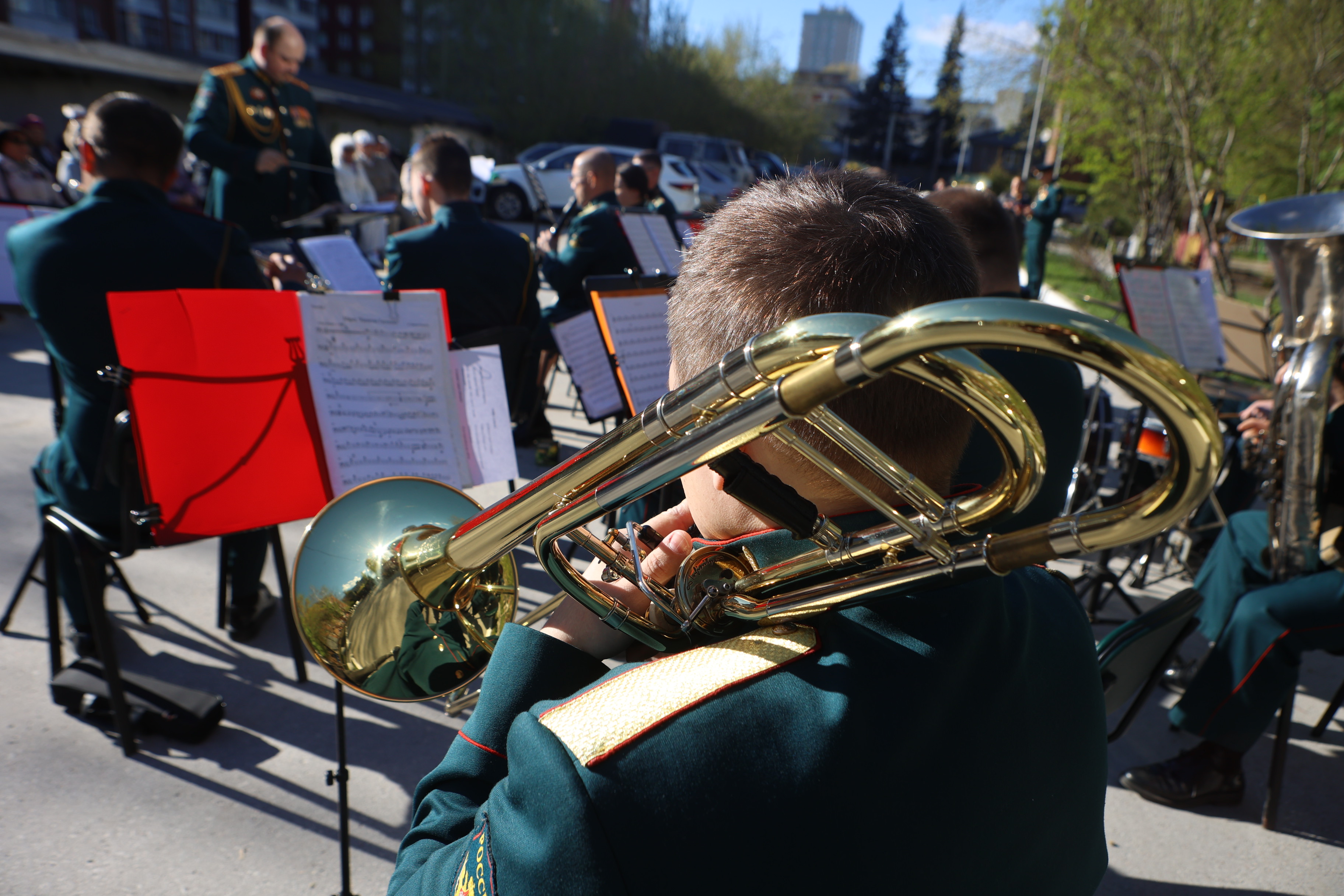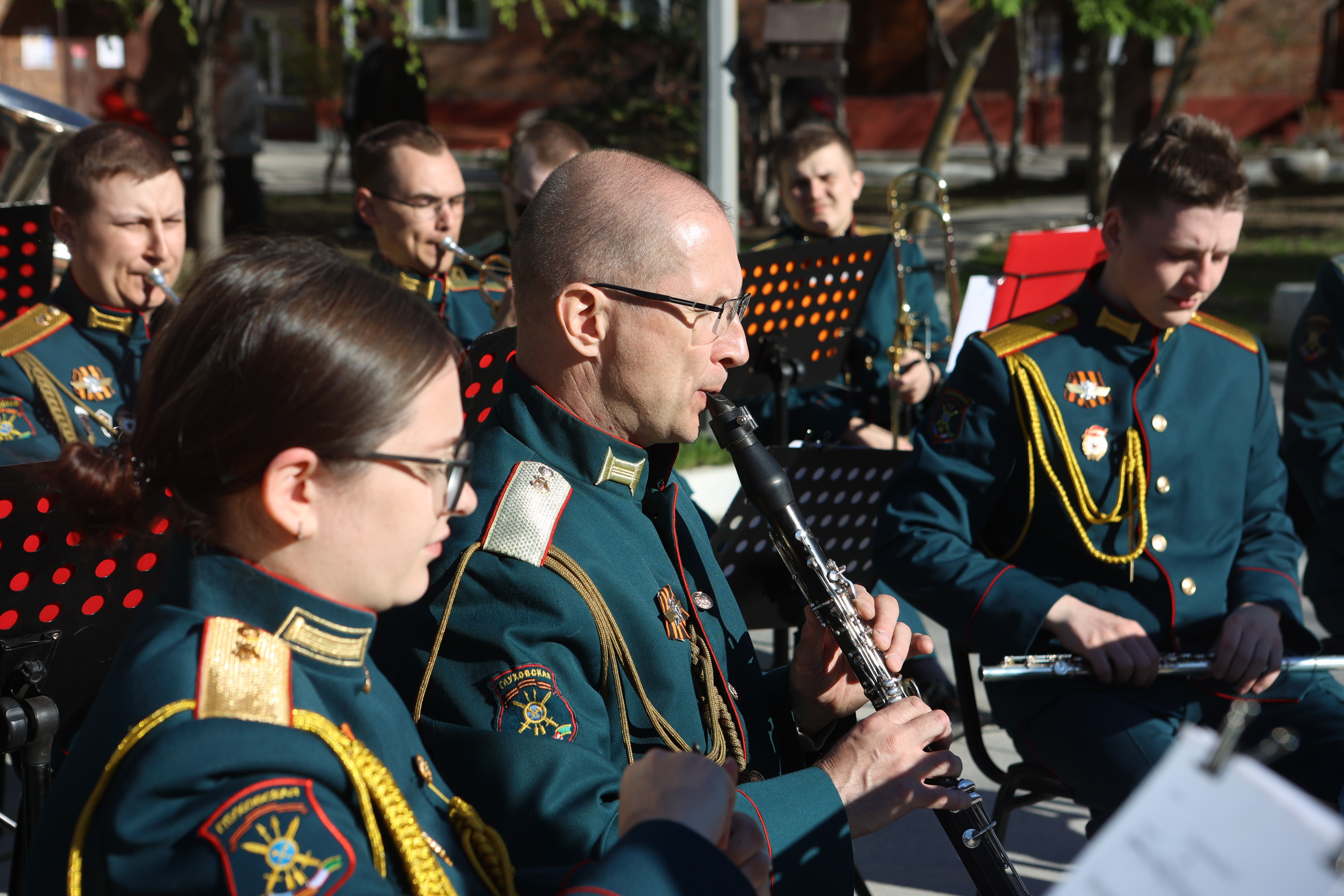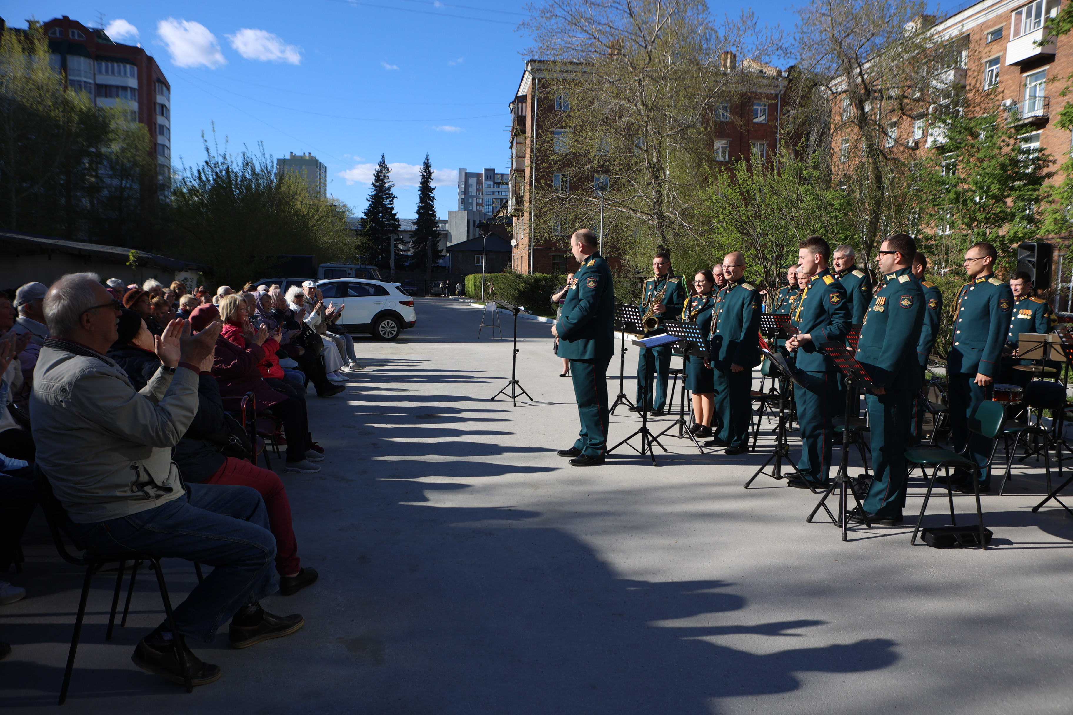 Праздничный концерт устроили возле библиотеки имени Карла Маркса в преддверии Дня Победы. Как рассказали организаторы, специальную программу зрителям представил военный оркестр 39-й ордена Ленина, Суворова, Кутузова и Богдана Хмельницкого ракетной дивизии под управлением дирижёра Дмитрия Головина.