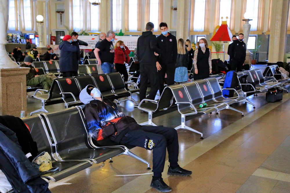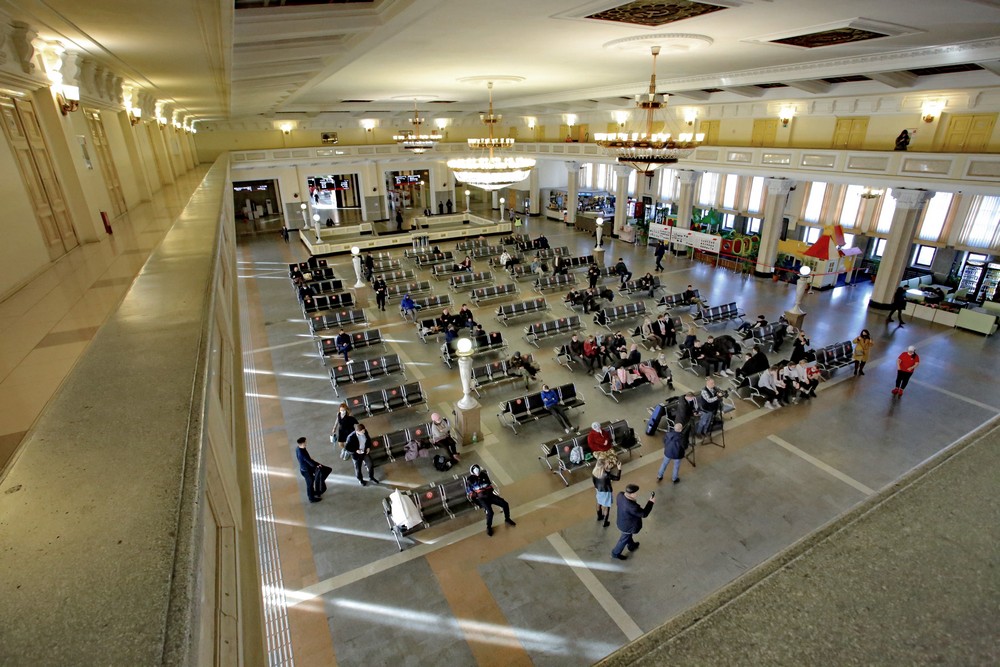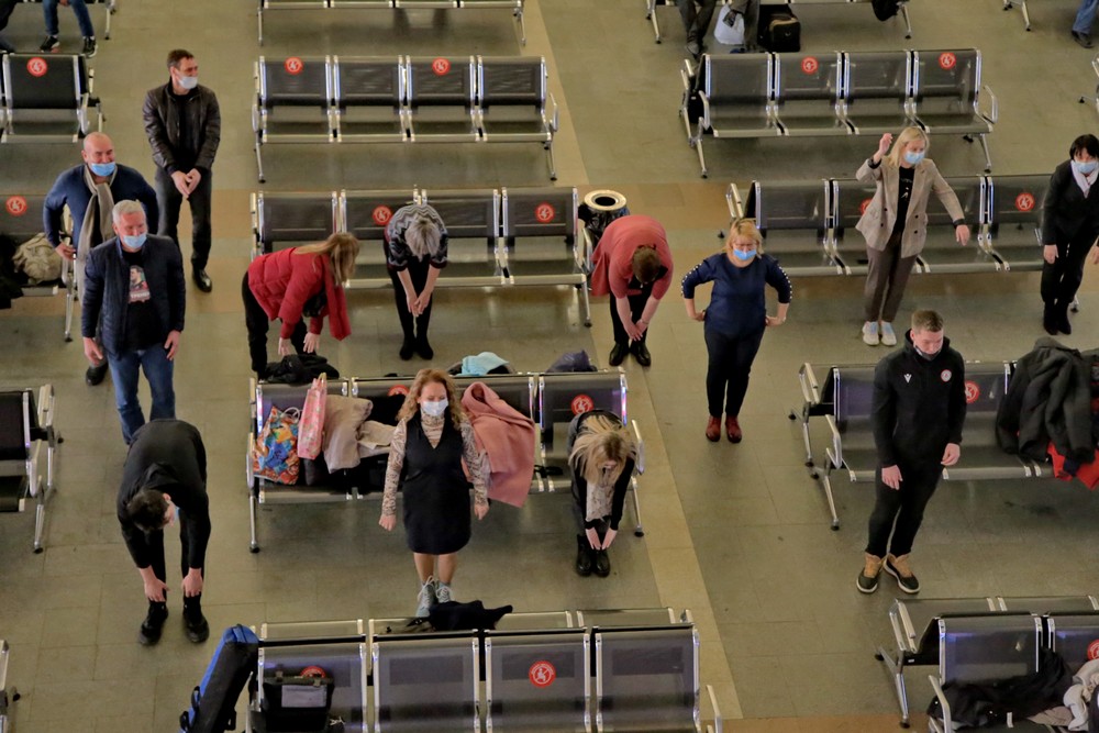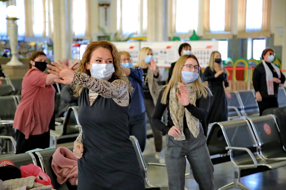 В зале ожидания железнодорожного вокзала зарядку проводят для пассажиров. Общеукрепляющая разминка помогает скоротать время. Хотя некоторые предпочитают тут поспать.