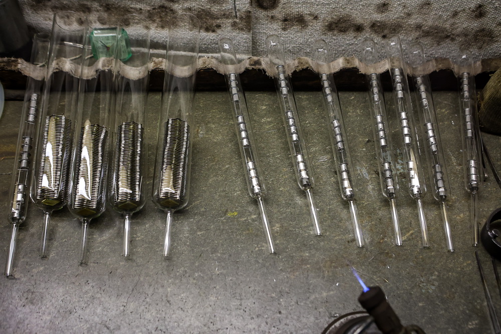 Для человека, далёкого от основ электровакуумной техники, производство фотоэлектронных умножителей выглядит завораживающе: чего только стоит отжиг металлических элементов в водородной печи или процесс алюминирования, когда покрытая спецсоставом стеклянная колба под воздействием высоких температур становится серебристой.
