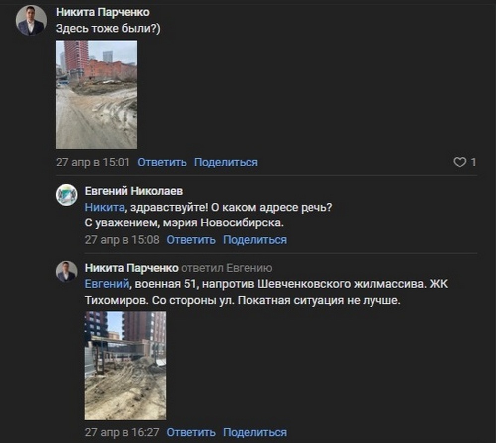 В апреле мэрия Новосибирска проинспектировала около сотни стройплощадок, чтобы выяснить — как там соблюдают правила мойки колёс спецтехники, выезжающей на дороги общего пользования. После публикаций о проверках через аккаунт главы города Максима Кудрявцева поступила жалоба на состояние территории у строящегося ЖК «Тихомиров».