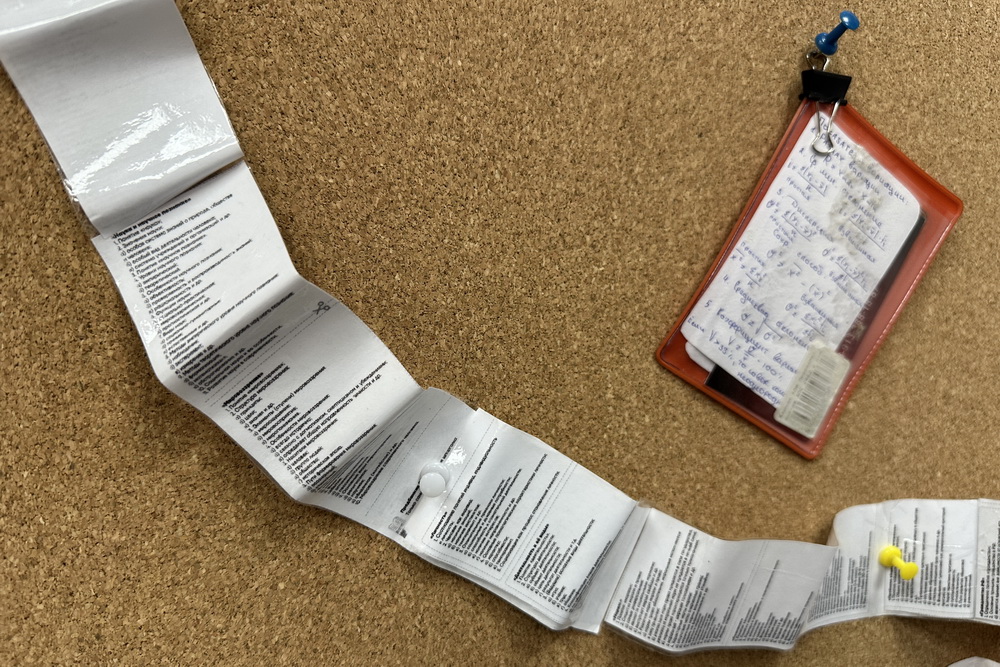 В этом году на выставке представили 23 шпаргалки. Например, здесь есть медицинская маска, внутри которой спрятаны листочки, и коробка сока с ответами внутри. Сотрудники университета даже составили собственную классификацию.