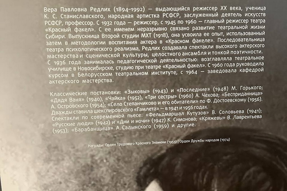 «Представлен материал из коллекции театрального музея новосибирского отделения союза театральных деятелей. Это был основной источник. Наша выставка называется „Из истории старой театральной фотографии“, она посвящена 130-летию со дня рождения народной артистки Веры Павловны Редлих.