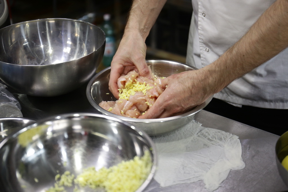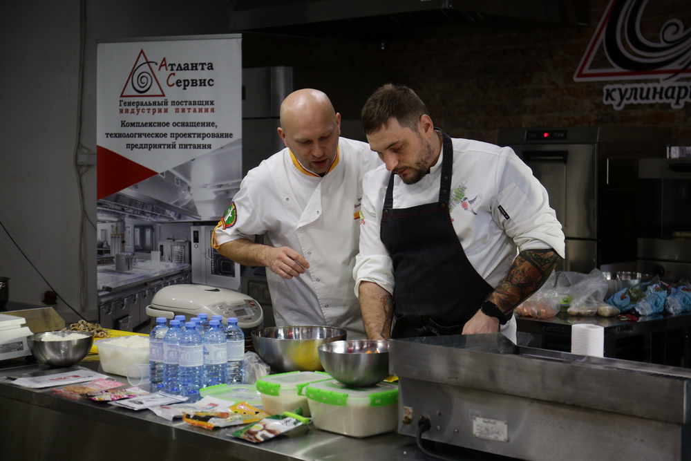 За столом только двое — остальные повара наблюдают и отмечают для себя особенности приготовления. Обязательно пробуют готовое блюдо.