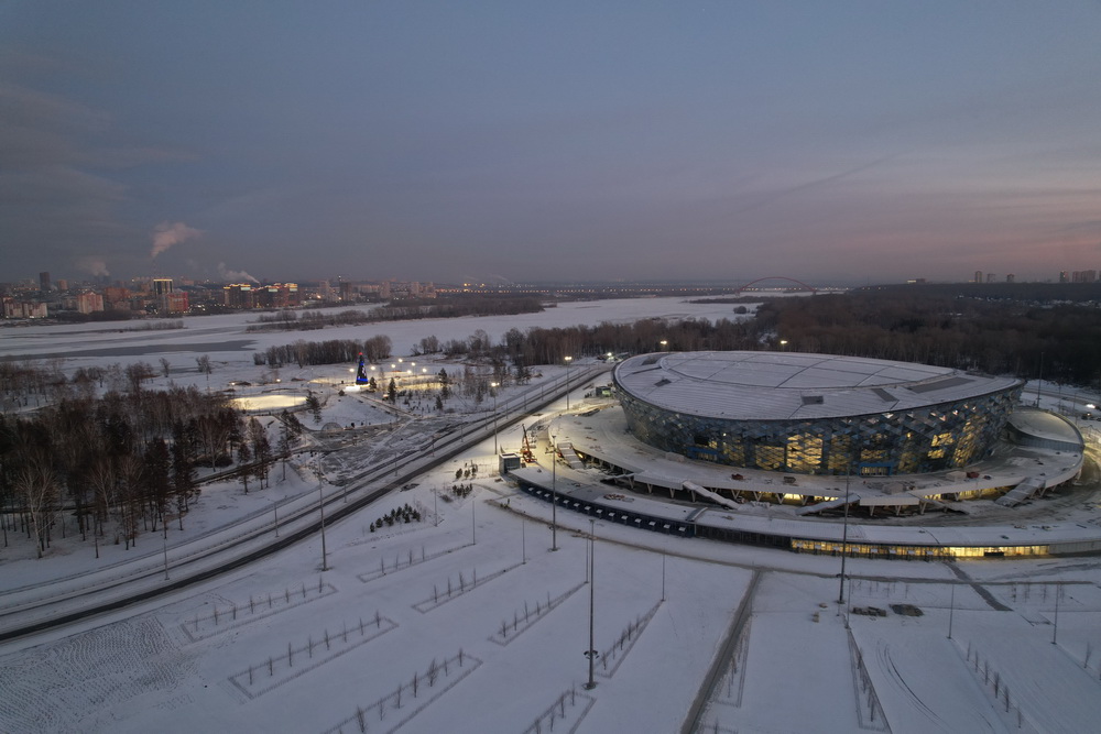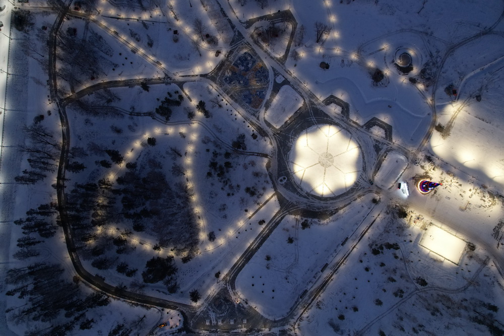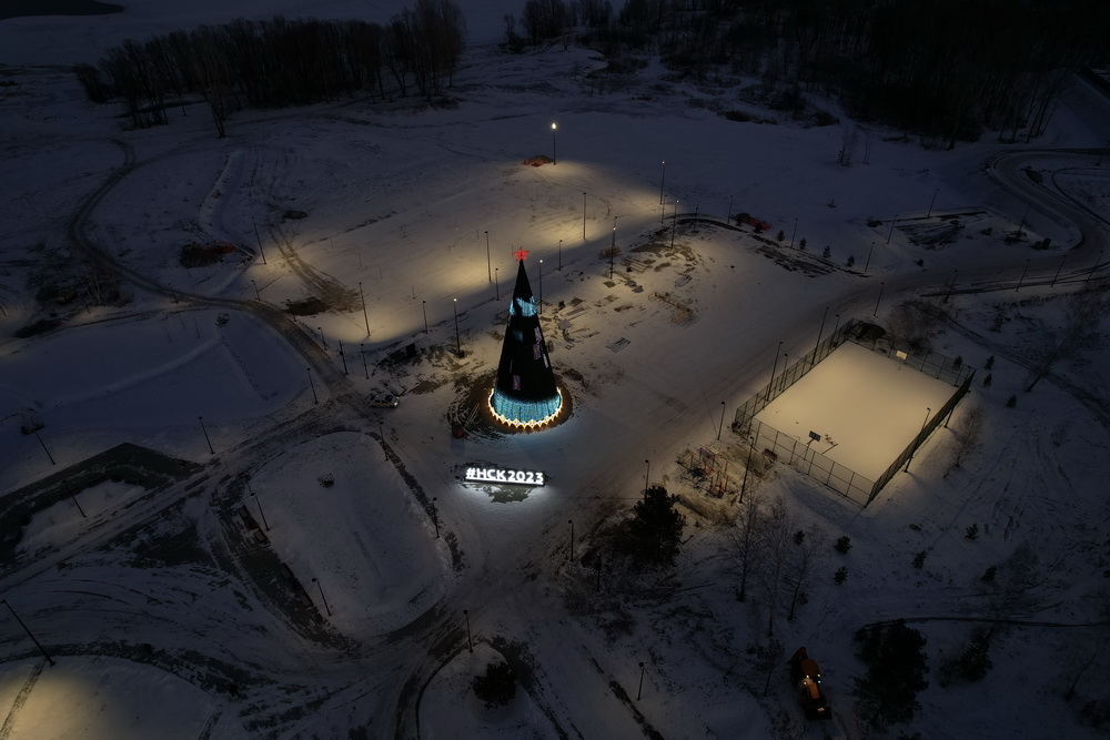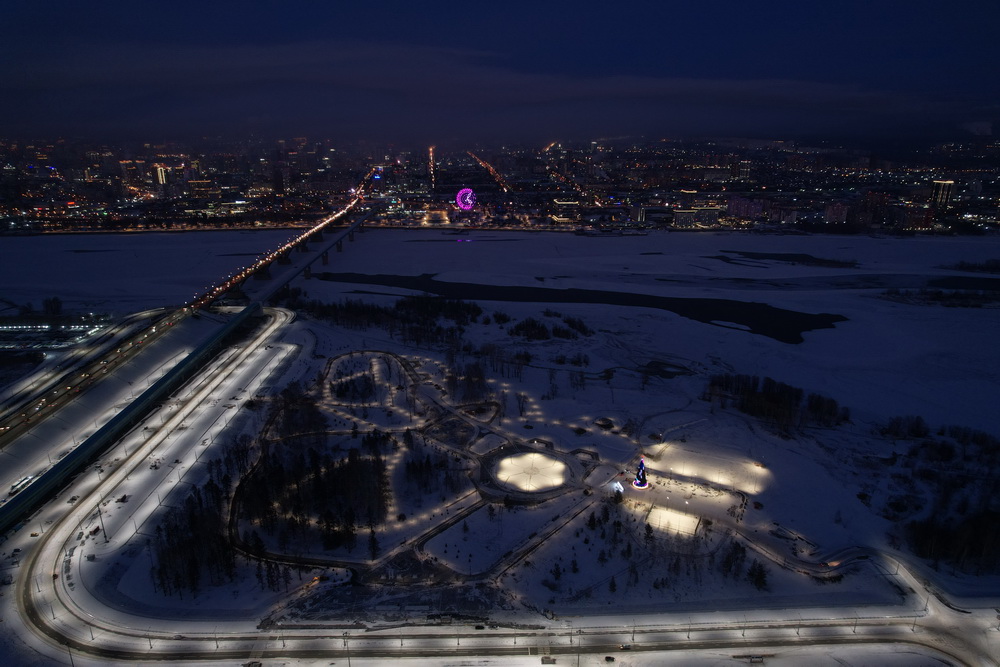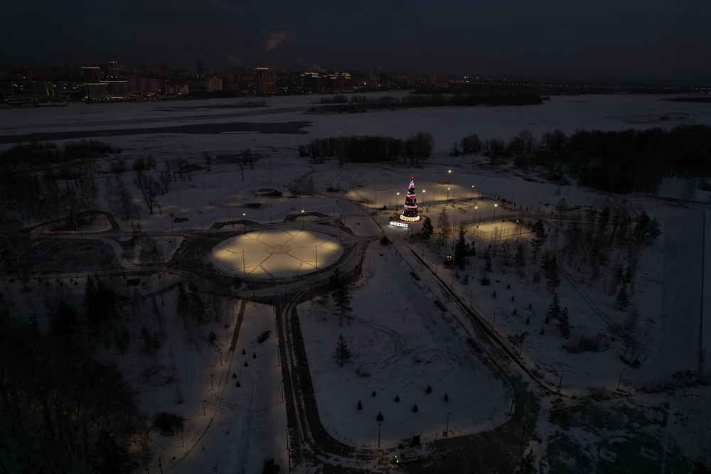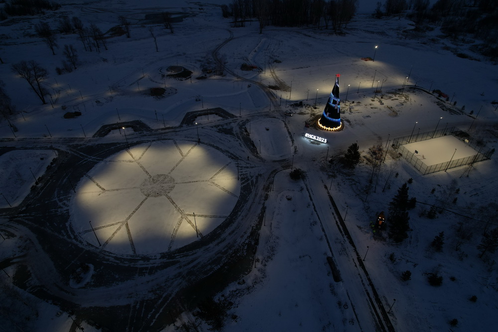 Особенно эффектно новогоднее убранство парка смотрится с высоты. Ёлку установили недалеко от площадки в форме снежинки. Современное световое оборудование способно проецировать на главный символ праздника любое динамическое изображение. Также в парке уже подсвечиваются все дорожки, сферический павильон с гирляндами и надпись «НСК 2023».