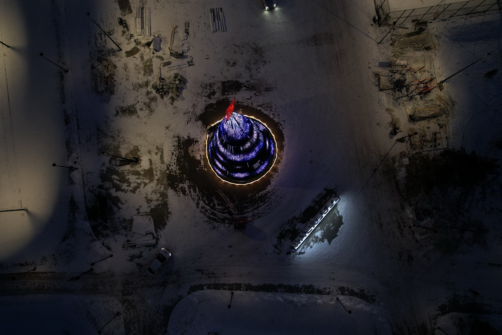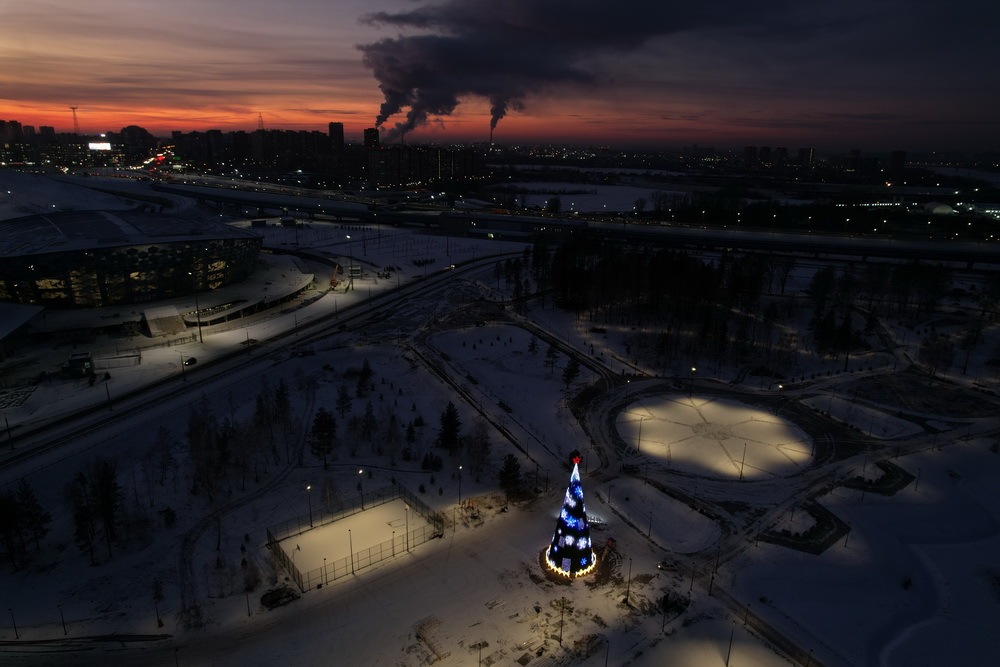 В парке возле строящейся ледовой арены зажигают праздничную иллюминацию. Разноцветными огнями уже горит необычная цифровая ёлка.