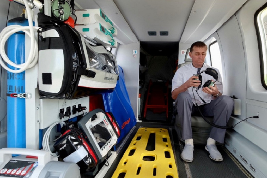 На борту — современная палата реанимации: аппарат искусственной вентиляции лёгких, дефибриллятор, вакуумный матрас. Из него откачивается воздух и пациент фиксируется в нужном положении.