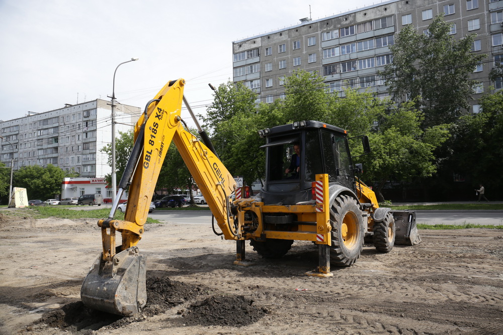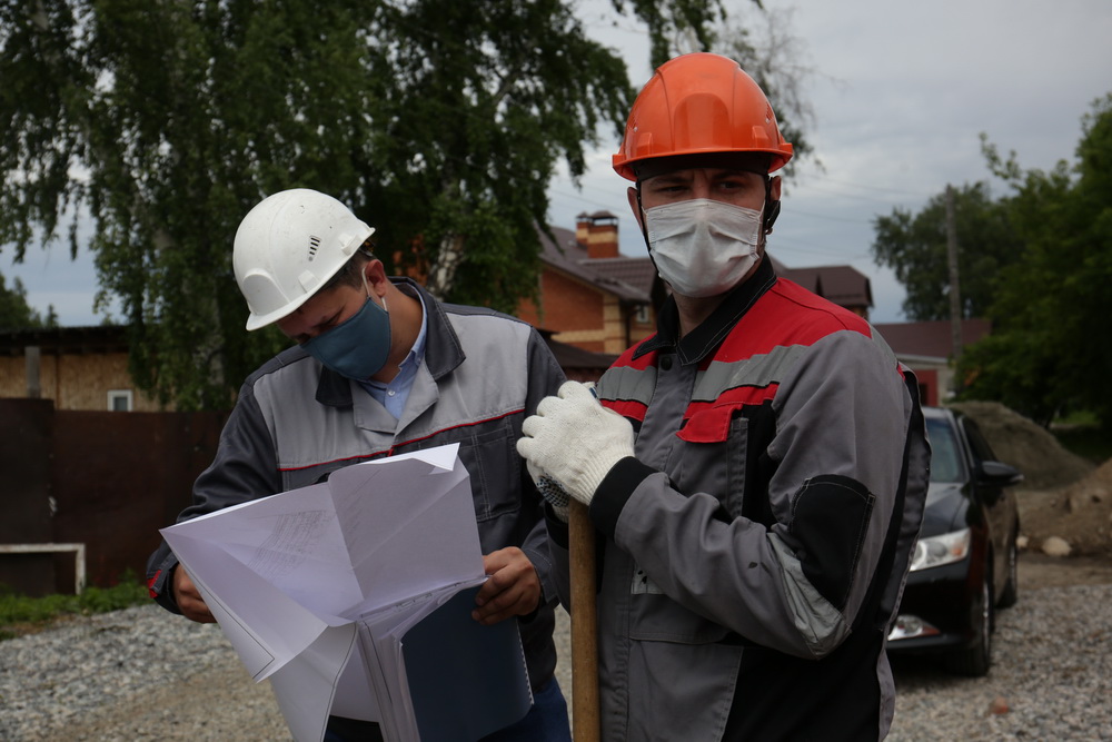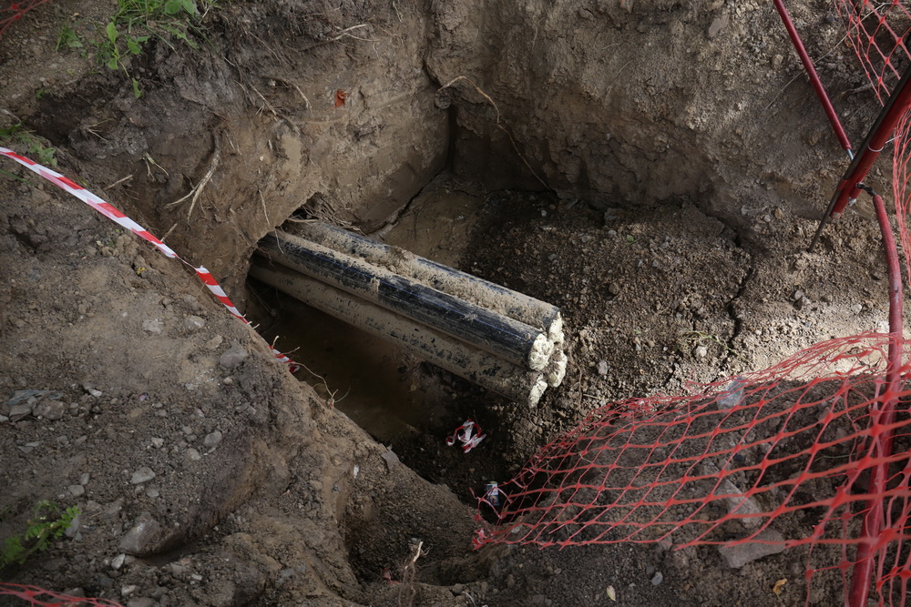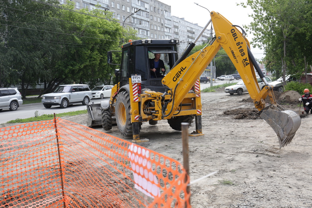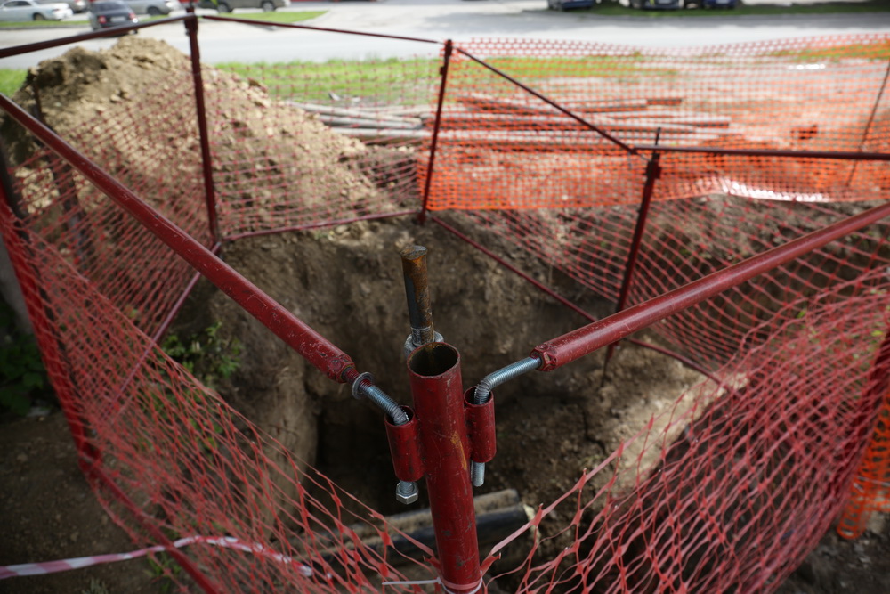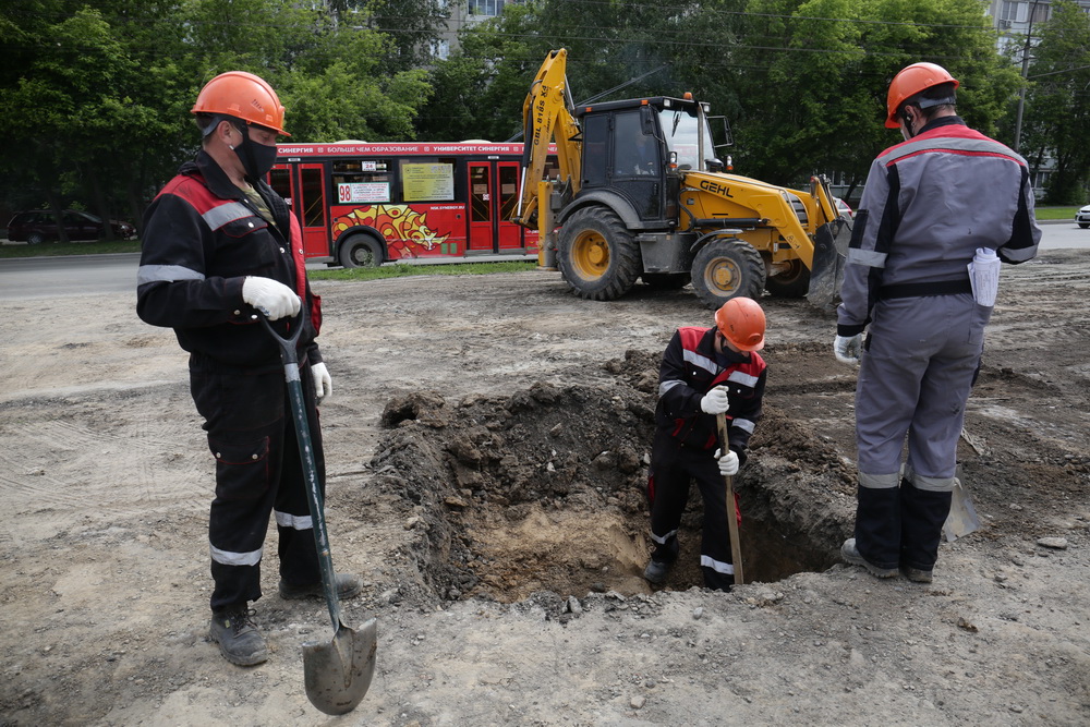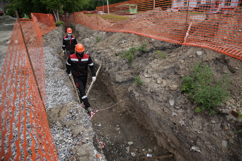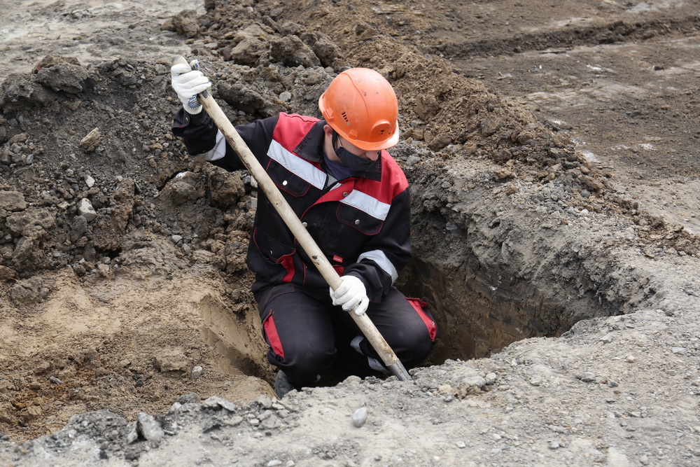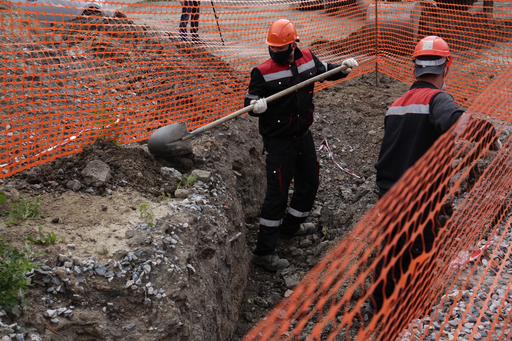 Траншеи копают вручную. Тяжёлую технику применяют только в самом начале работ или если нужно бетонную плиту убрать. Энергетики осторожничают — здесь же пролегает действующая линия электропередачи; она под напряжением.