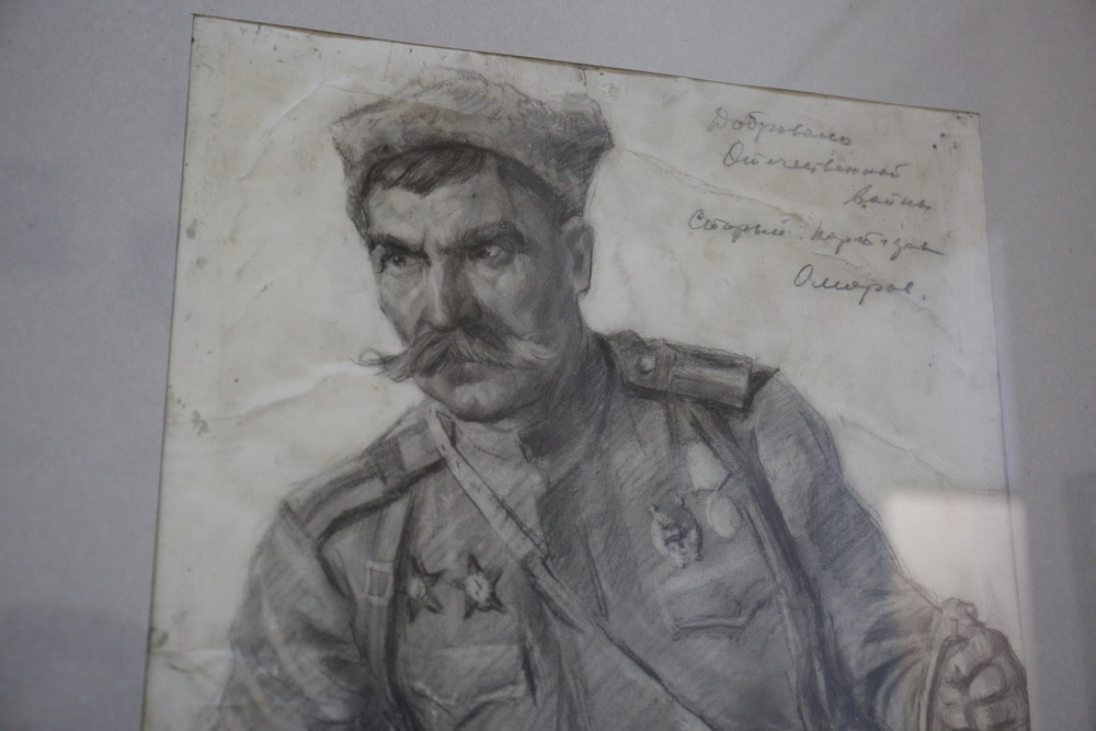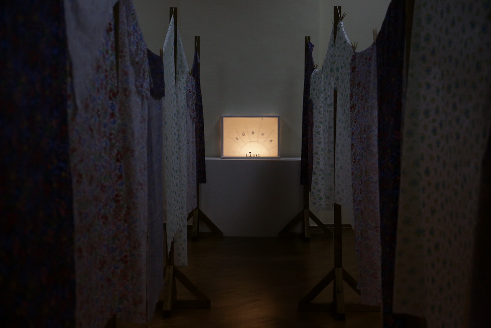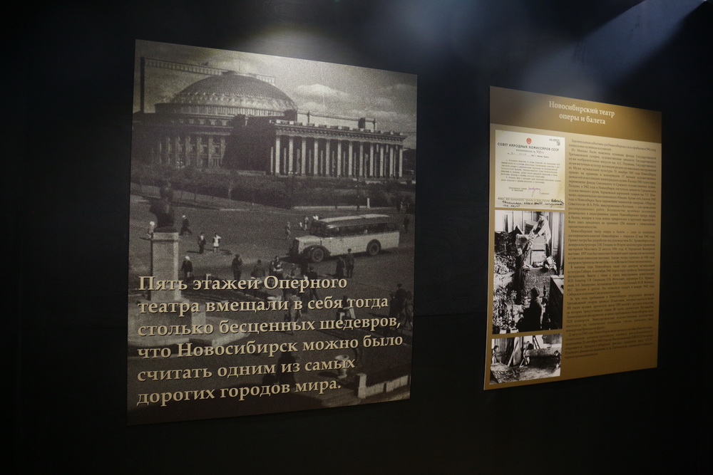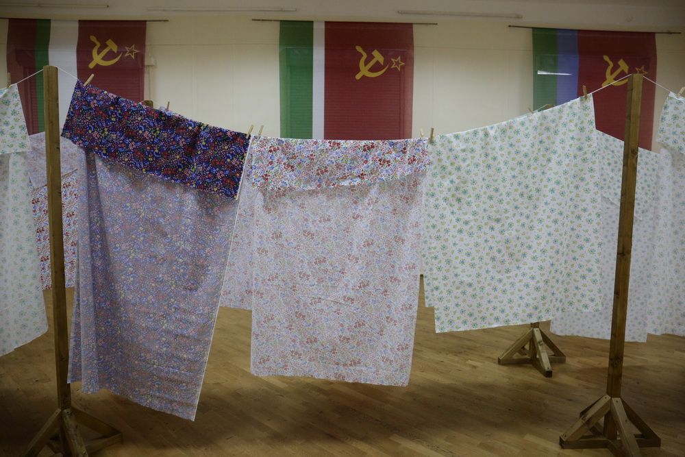 «Первый зал — это ещё нет войны. Лето 1945 года. Выпускные, каникулы, дети у бабушки. Это как раз инсталляция сушения белья. На стоечках лежат бинокли, если в них посмотреть, мы увидим, что надвигалось на нашу страну. Зал „Искусство войны“, так как мы в первую очередь говорим про искусство. Перед этим был зал, где художники Новосибирска — висят их документы. У кого-то наградные, у кого-то похоронка. И, переходя из того зала в этот, мы видим тут большую гору подрамников. Они не дождались своих художников, к сожалению», — рассказала член Союза дизайнеров России Виктория Бабикова.
