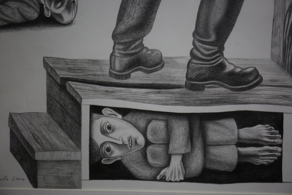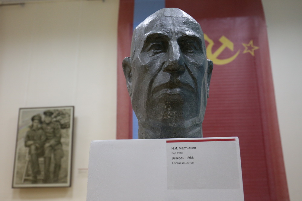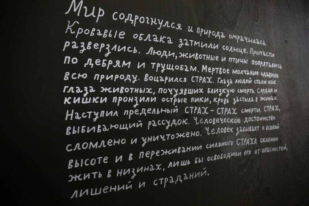 Скульптуры, графика, digital art — и всё это о войне. Инсталляции в художественном музее готовили дизайнеры. У каждого зала своя атмосфера, в некоторых даже страшно. Эмоции и дрожь выставка вызывает даже у её создателей.