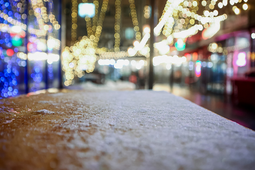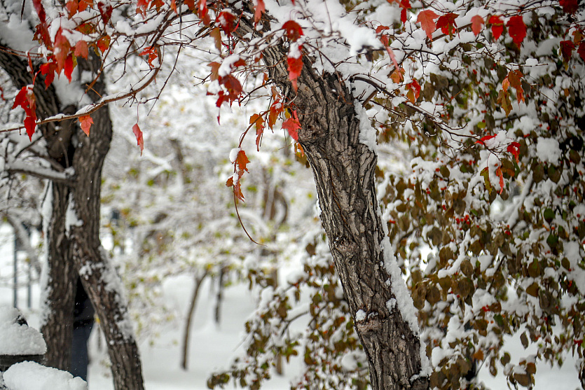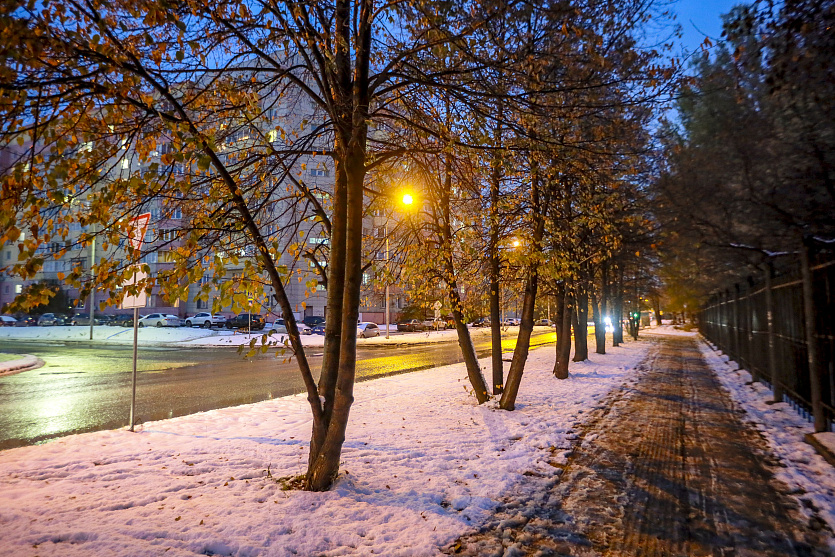 Яркие краски осени смешались с белым цветом и необычно украсили город. Свет фонарей, отражаясь в снежинках, добавляет улицам сказочную атмосферу.