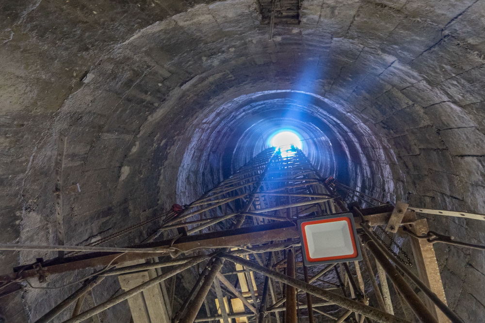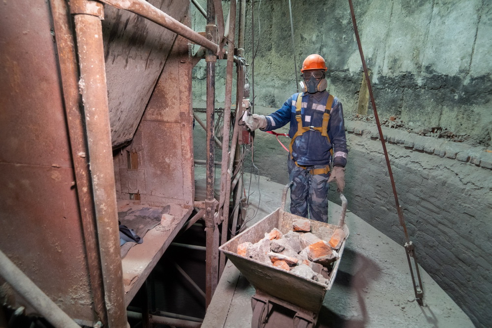 Рабочим пришлось на высоте разобрать сотню кубометров кирпичной кладки и сварить 14 тонн арматуры, чтобы обновить дымовую трубу. Теперь она прослужит ещё 90 лет.
