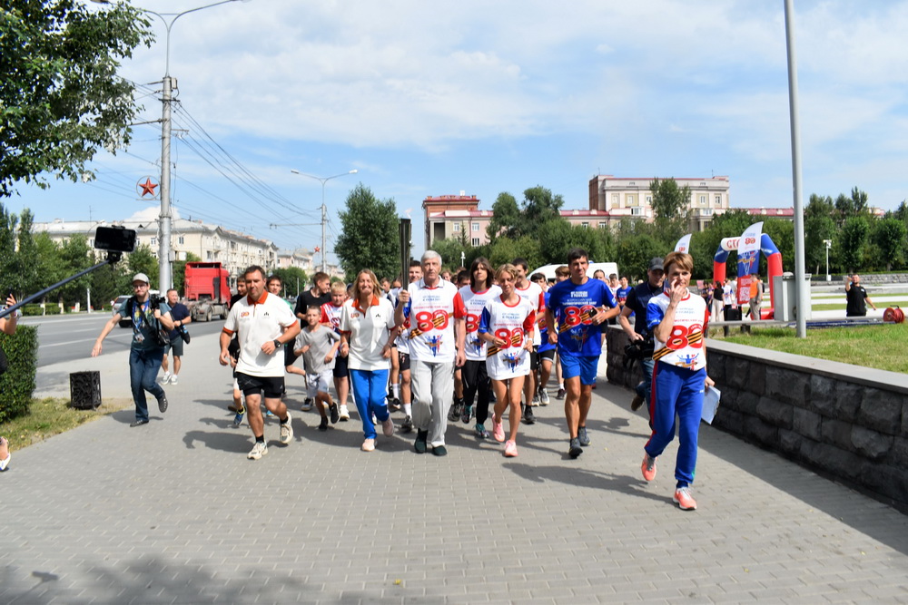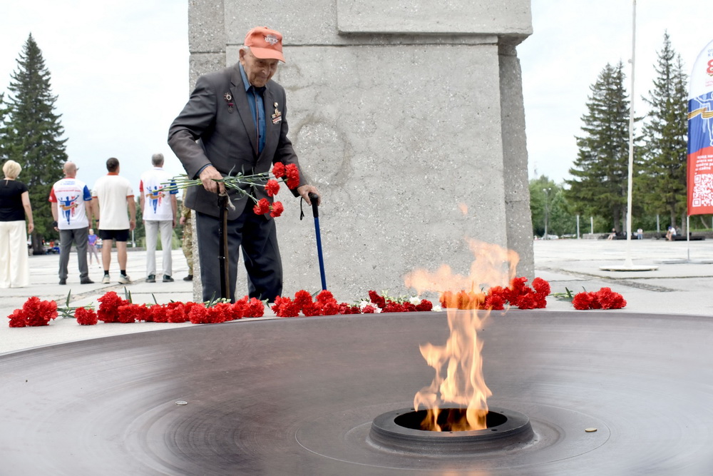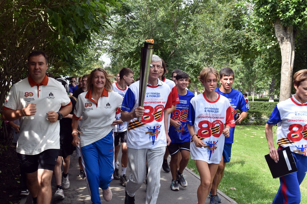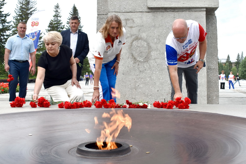 Новосибирцы пробежали с пламенем 1418 метров. Вице-губернатор Валентина Дудникова напомнила, что ровно столько дней продолжалась Великая Отечественная война.