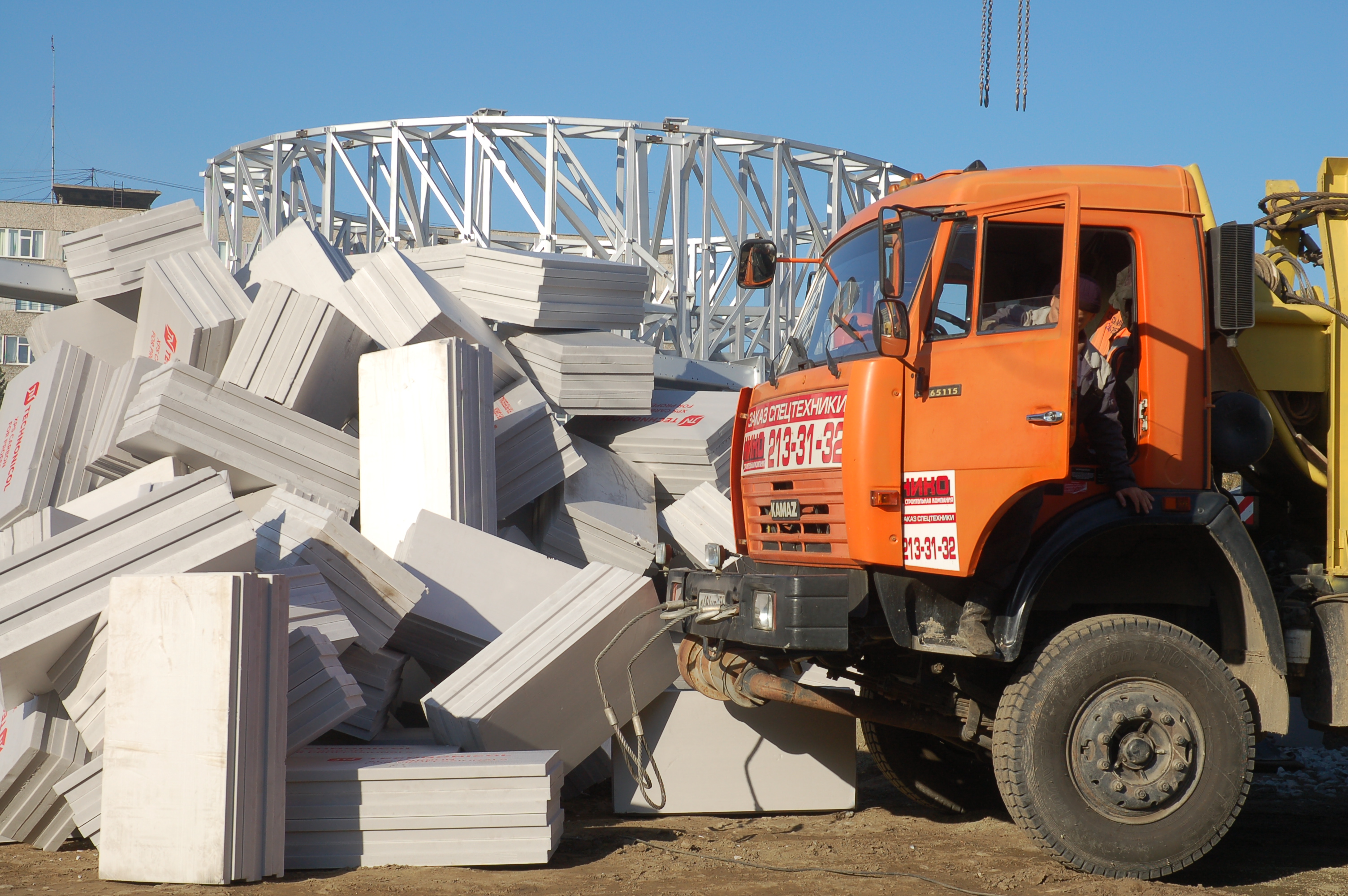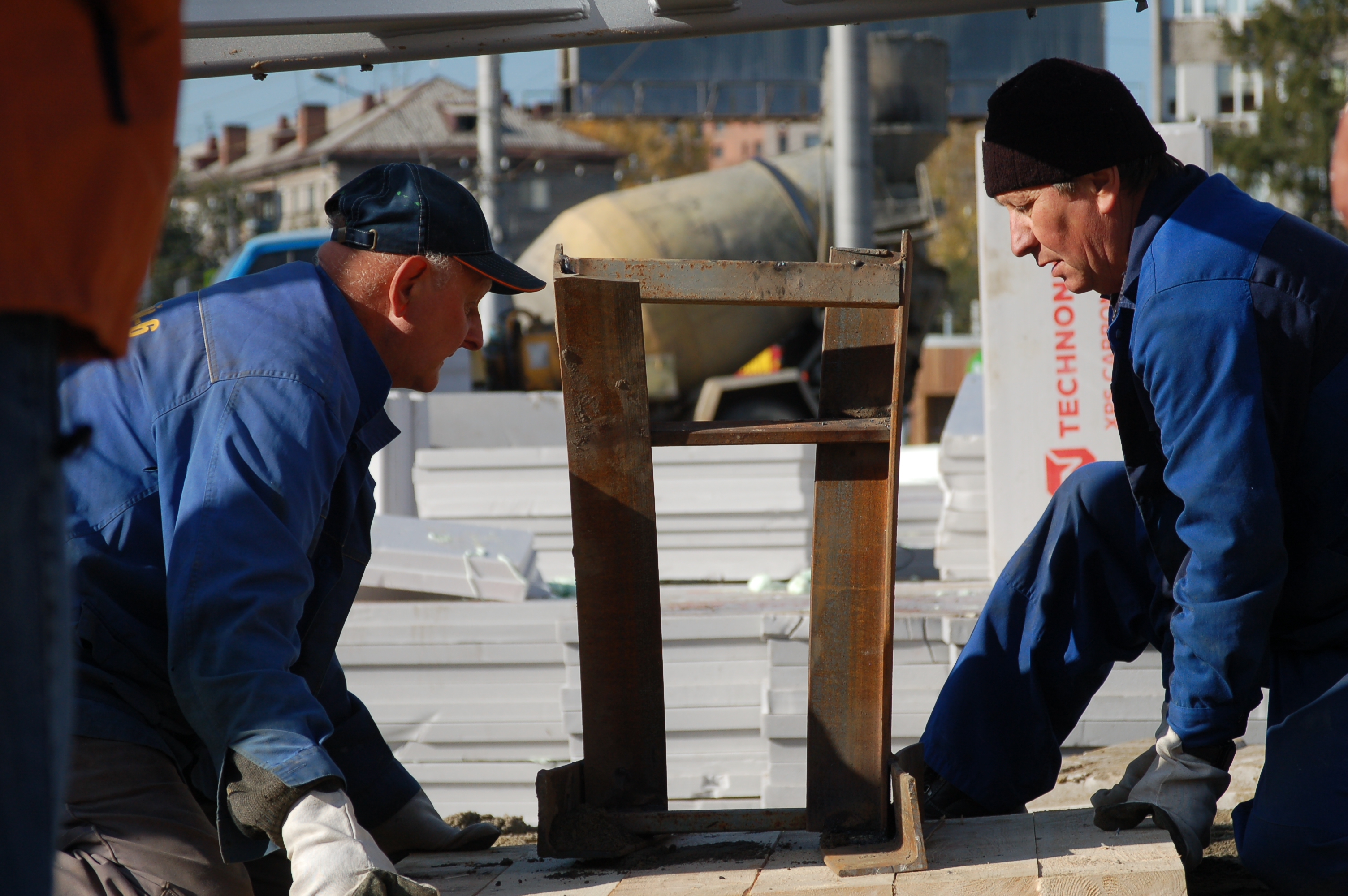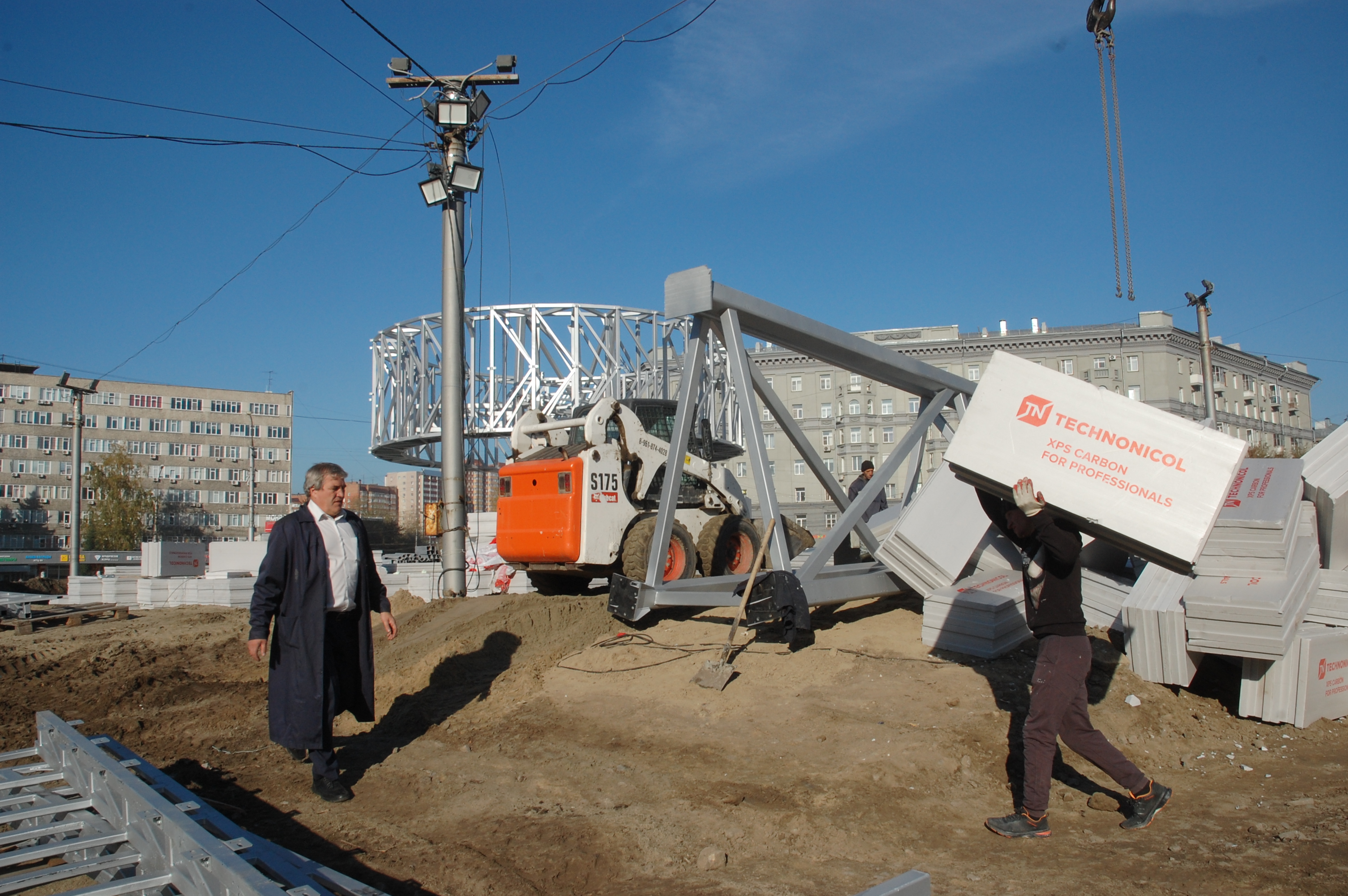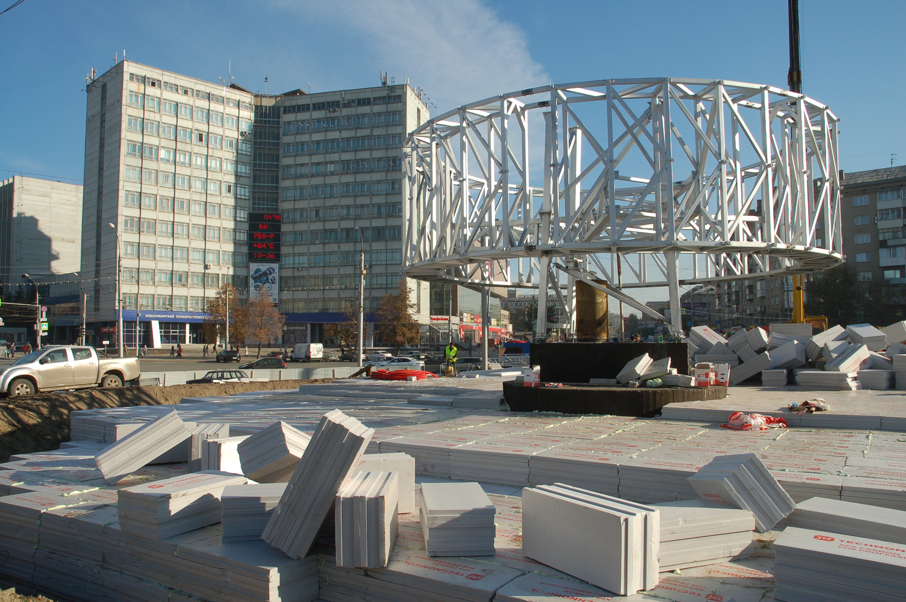 Основание будущей стелы прокладывают утеплителем. Вес конструкции — 20 тонн, а под землёй находится свод станции метро «Заельцовская». Использование лёгкого, но прочного материала позволит снизить нагрузку.