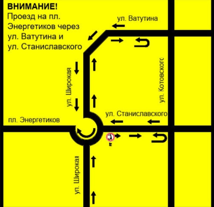 Если вы будете двигаться по улице Широкой со стороны Троллейной, то левый поворот на площадь Труда будет вам запрещён. В этом случае, чтобы попасть на площадь Энергетиков, грузовики должны будут проехать на улицу Ватутина и развернуться на ней до перекрёстка с Котовского. Остальные виды транспорта могут сделать так же либо развернуться на улице Станиславского в месте её пересечения с Котовского.