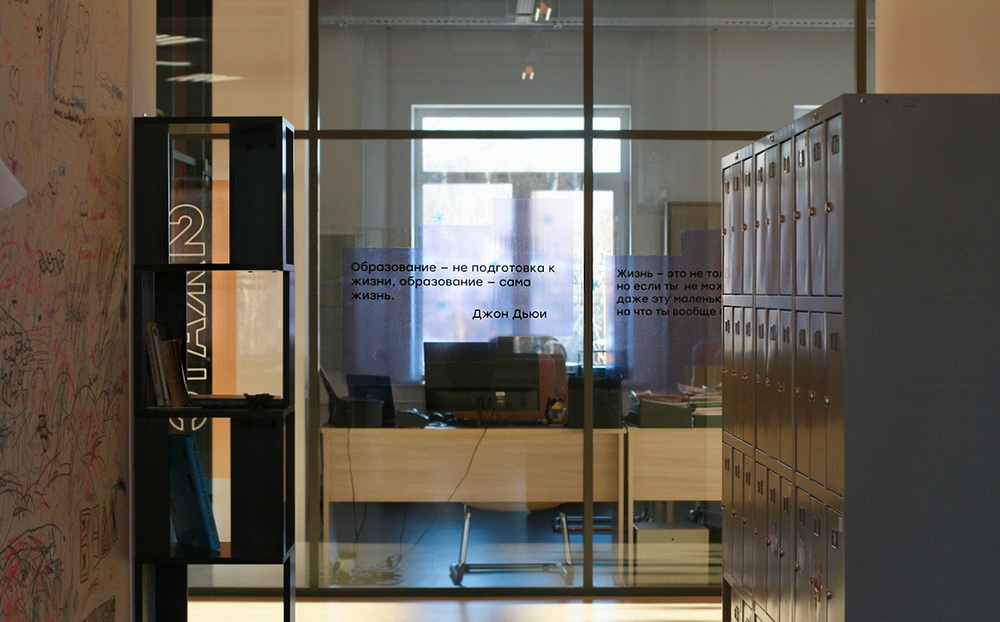 Все внутренние перегородки в здании прозрачные. Их снабдили цитатами известных педагогов. Это создаёт ощущение большого открытого пространства, сквозь которое свободно проходят солнечные лучи — и ничего им не мешает. Даже учительская на виду.