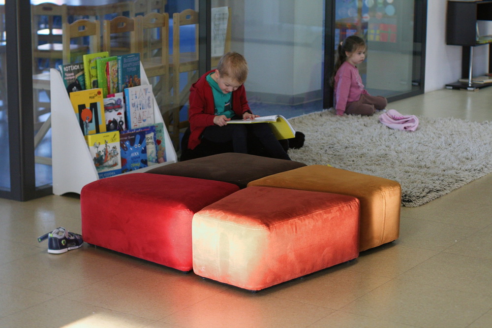 Дошкольные группы и аудитория первоклашек расположены на втором уровне школы. У них отдельный вход, две комнаты с кроватями-трансформерами, которые спрятаны в стенных шкафах, и большой зал, где можно сидеть на полу — играть или читать.